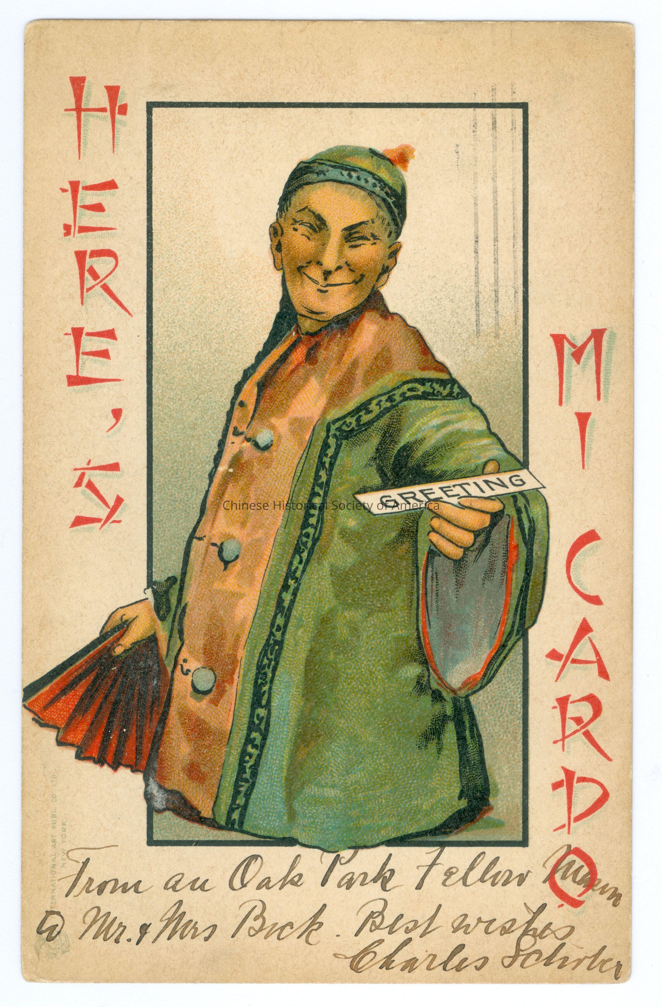 Color. Illus. Caricatures; Chinese Men: A Chinese man wearing a hat and a queue and green traditional clothing, he is holding a fan and his other hand is holding a sign that says "Greeting," he has slanted eyes and a smile.