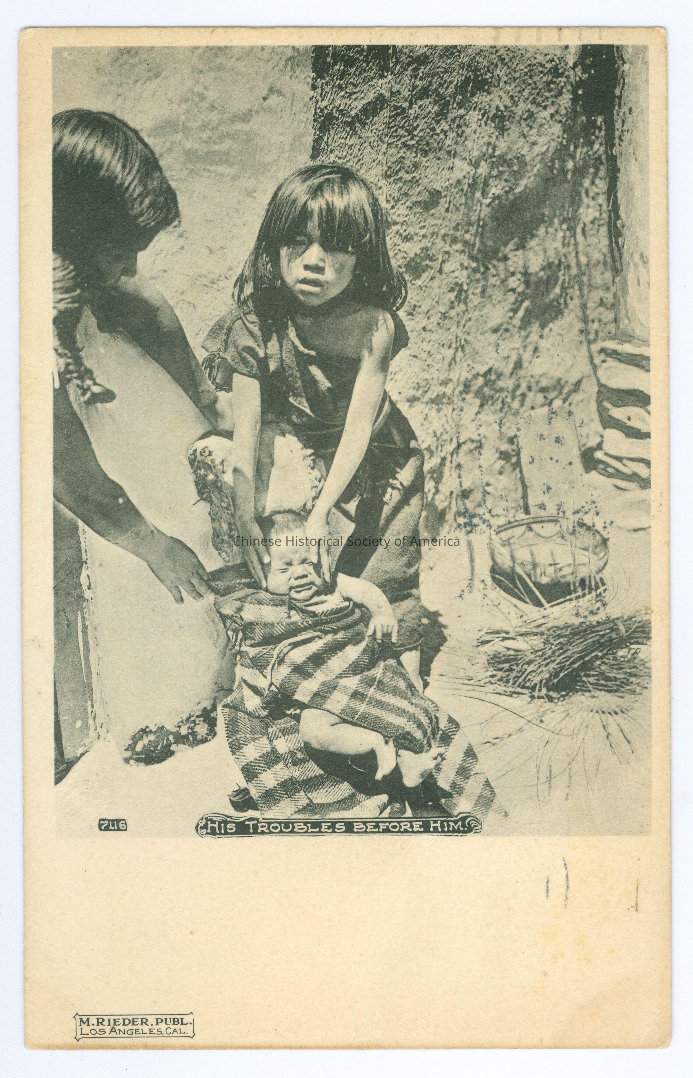 Front: Caption: "7116 His Troubles Before Him." "M. Rieder, Publ. Los Angeles, Cal." Back: Postmark: "San Diego, Cal. Jul 10 1905 6-PM"; "Los Angeles, Cal. Jul 10 1905 3:30 PM", stamped in black. Stamp: A green one cent stamp with a picture of Benjamin Franklin. Address: "Mr. Charlie Rogers, 336 W. 11th St., Los Angeles, Cal."