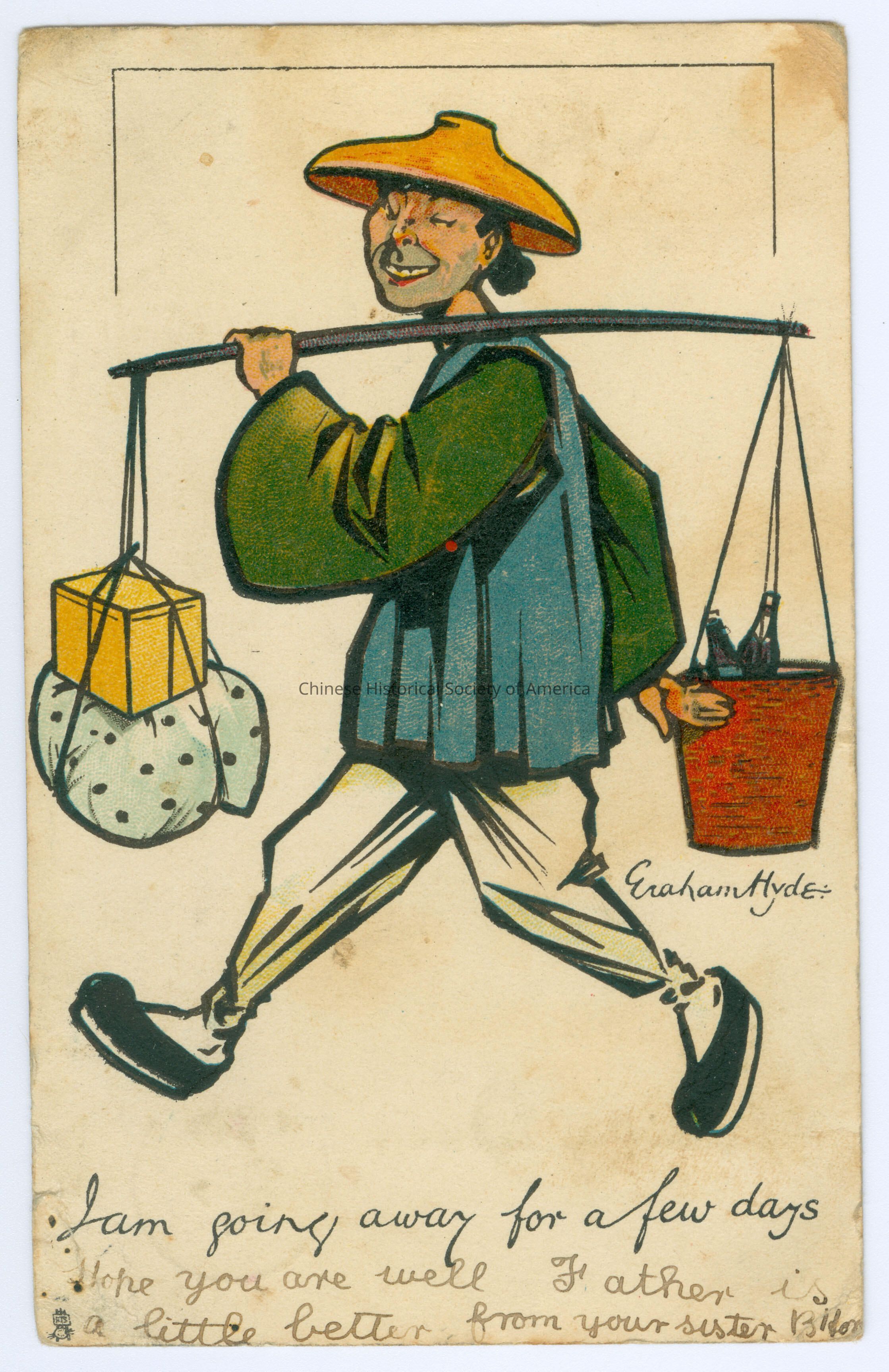 Color. Illus. Eraham Hyde Caricatures; Chinese Men; Traveling: A Chinese man with a straw hat and a smile, he is walking with a bundle and box and a basket of drinks hanging from a pole balanced on his shoulder.