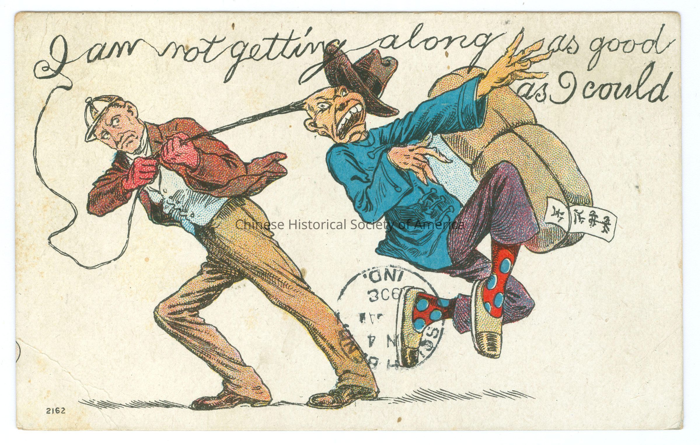 Color. Illus. Caricatures; Laundry: A Chinese man wearing traditional clothing in blue and is wearing a hat, he is yanked by by his queue by a White man in brown, his laundry bag is flying as well.