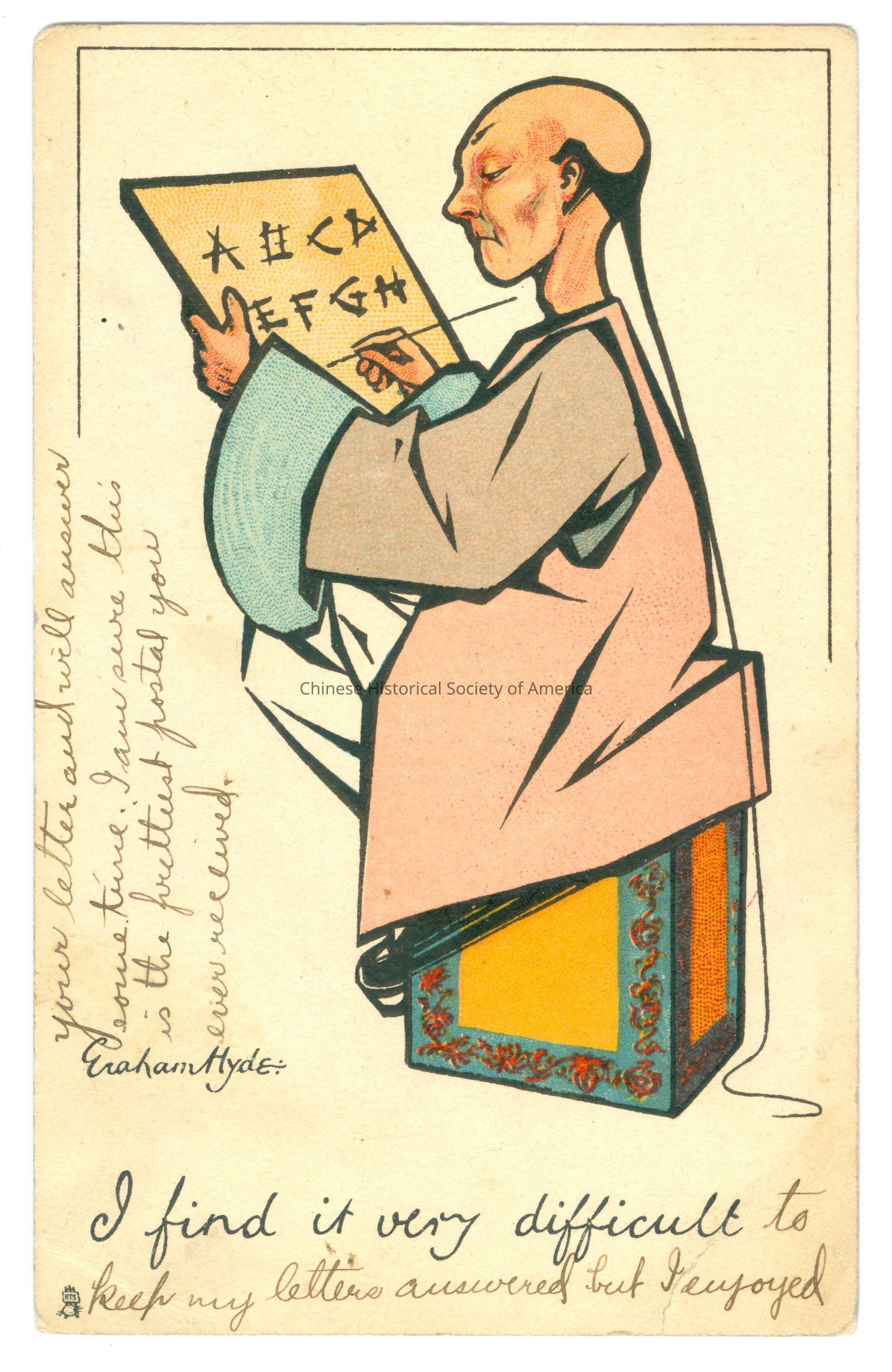 Color. Illus. Eraham Hyde Caricatures; Chinese Men; Writing: A Chinese man with a quuee is sitting on a crate writing the ABC's on a paper.
