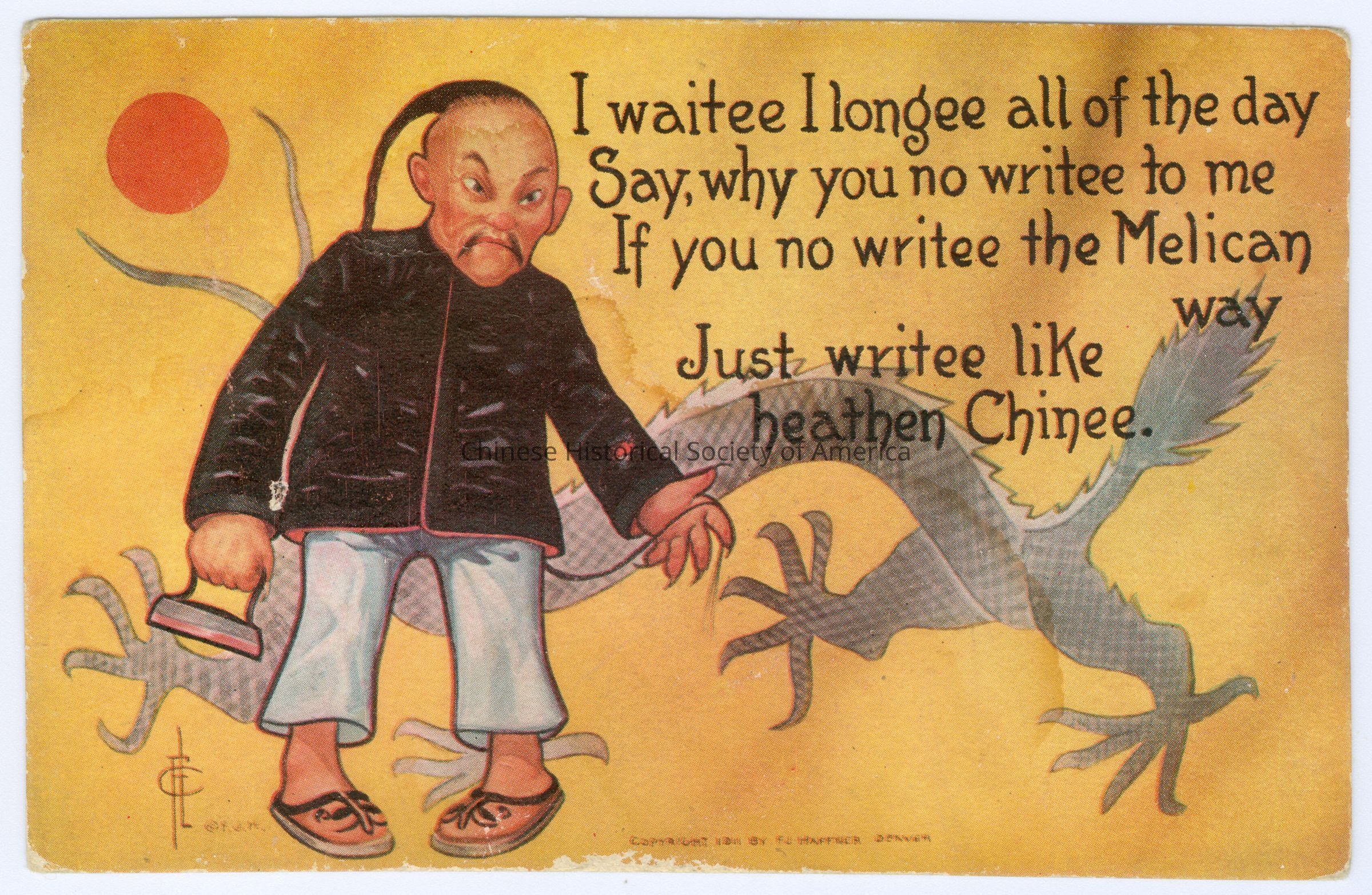Front: Caption: "I waitee I longee all of the day Say, why you no writee to me If you no writee the Melican way Just writee like heathen Chinee." "Copyright 1911 By F.L. Haffner Denver." Back: "World-Beater Series No. 5472." Old Accession #: AAE