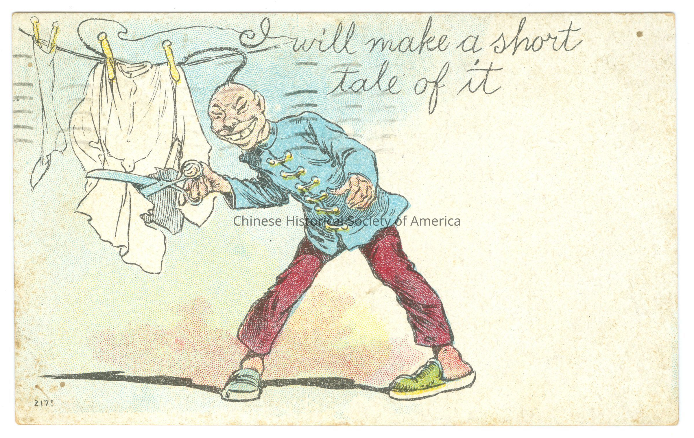 Color. Illus. Caricatures; Laundry: A Chinese man wearing traditional clothing in blue and red has a queue that is flying in the air, he has slanted eyes and is smiling widely while he is using scissors to cut clothing hanging on a clothesline.