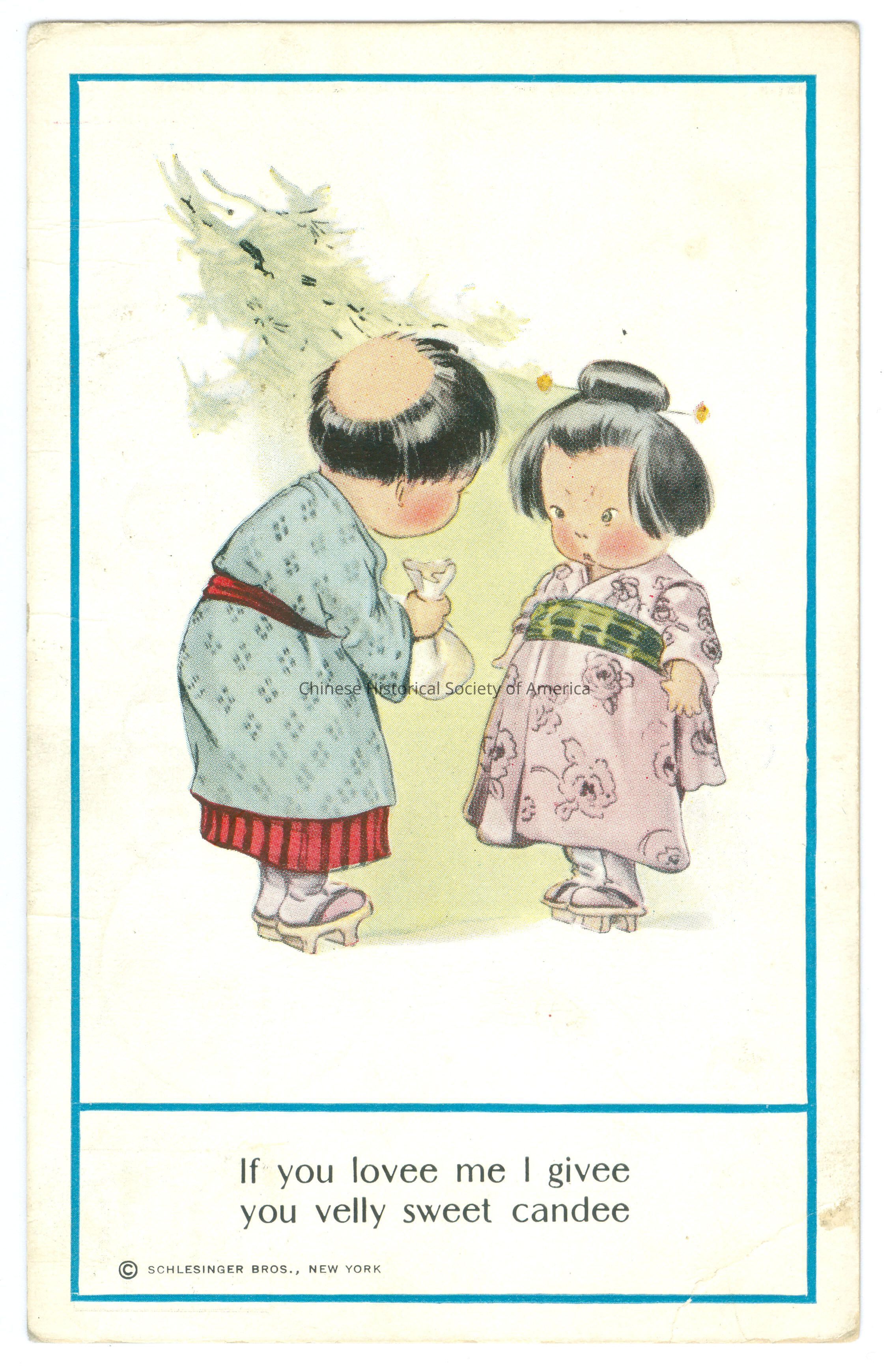See CHSA-05004, 05005 B, 05006-05008. Front: Caption: "If you lovee me I givee you velly sweet candee." "Schlesinger Bros., New York." Back: Postmark: "Dumont, N.J. Feb. 13 1914", stamped in black. Stamp: A green one cent stamp with a side picture of George Washington. Addressee: "Miss Catherine Palmer Dumont, N.J."
