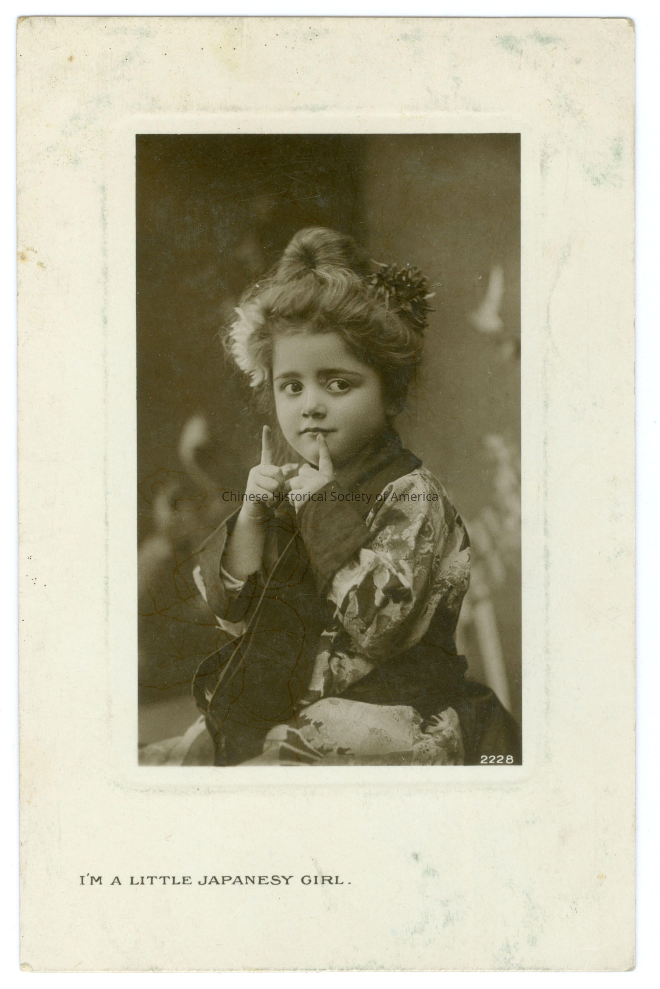 Front: Caption: "I'm A Little Japanese Girl." "2228." Back: Postmark: "Philadelphia, PA, Sep 25 1908 10:30 AM", stamped in black. Stamp: A green one cent stamp with a picture of Benjamin Franklin, "Series 1902, United States of America, 1706 Frank". "Eamforth & Co..Publishers, Holmfirth and New York (Printed in Germany)". Address: "Miss Jeannette P Aarons, 2410 W. Girard Ave. Phila Pa." Message: "Sept 26 1908 Happy News to you. Love and kisses from Aunt Vinnie". Old Accession #: DEX