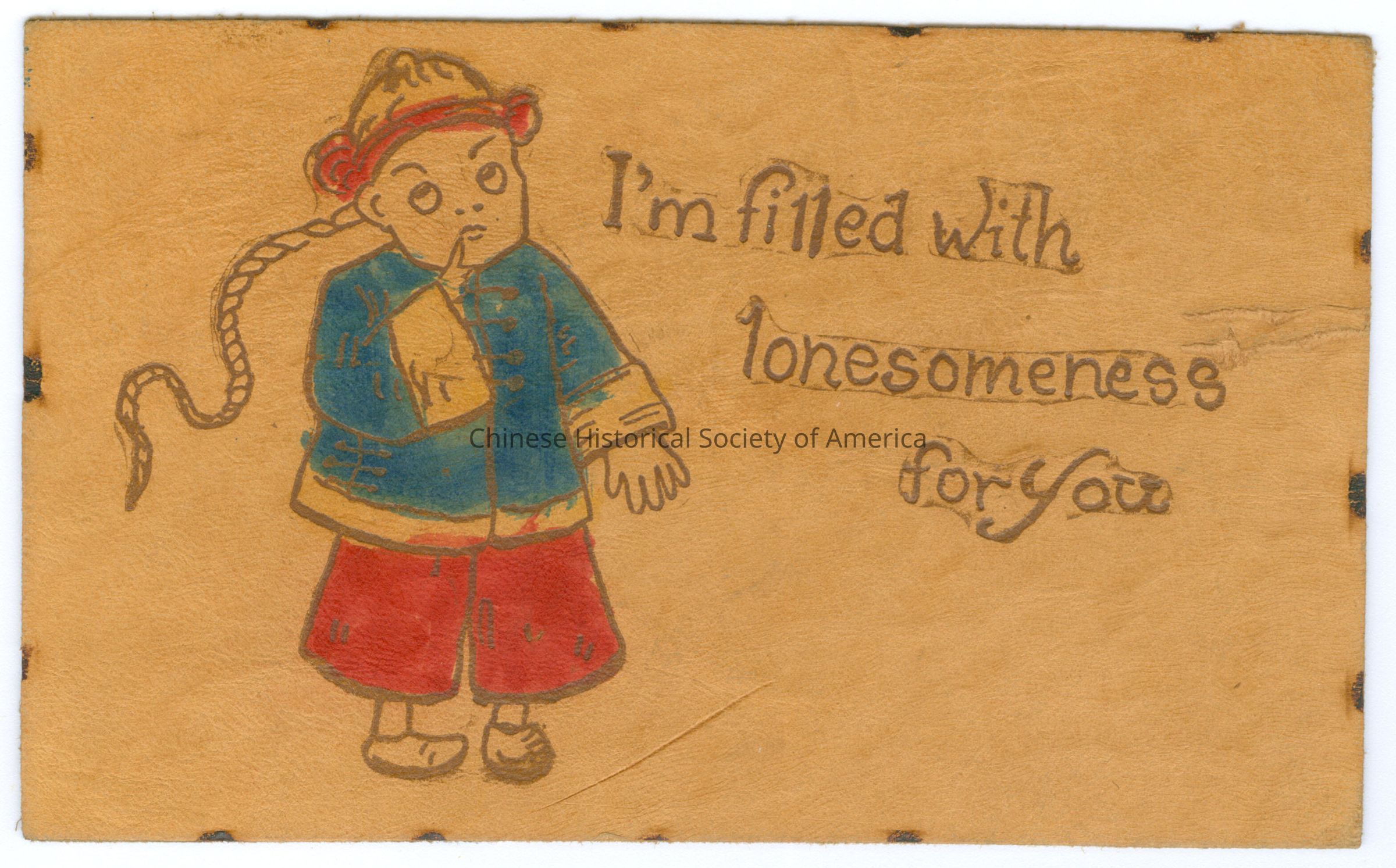 See CHSA-04975-04983. Front: Caption: "I'm filled with lonesomeness for you." Back: Address: "Miss Olive Potter, Indianola Iowa", handwritten in black. Old Accession #: N/A