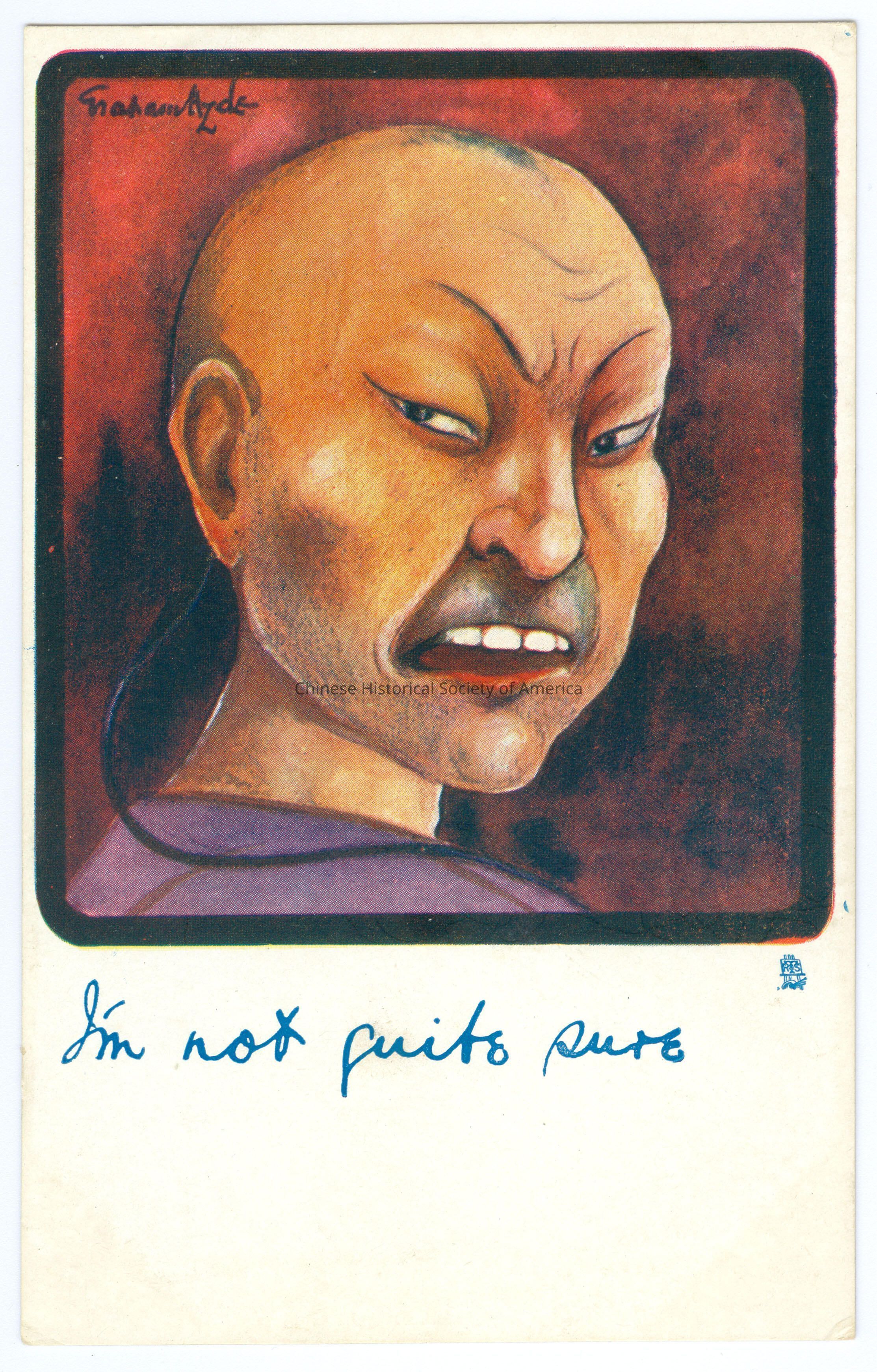 Color. Illus. Eraham Hyde Caricatures; Chinese Men: Head shot of a Chinese man with a skinny queue and slanted eyes, he is looking over his shoulder, he is wearing a purple shirt and has a puzzled look on his face and is showing his teeth.