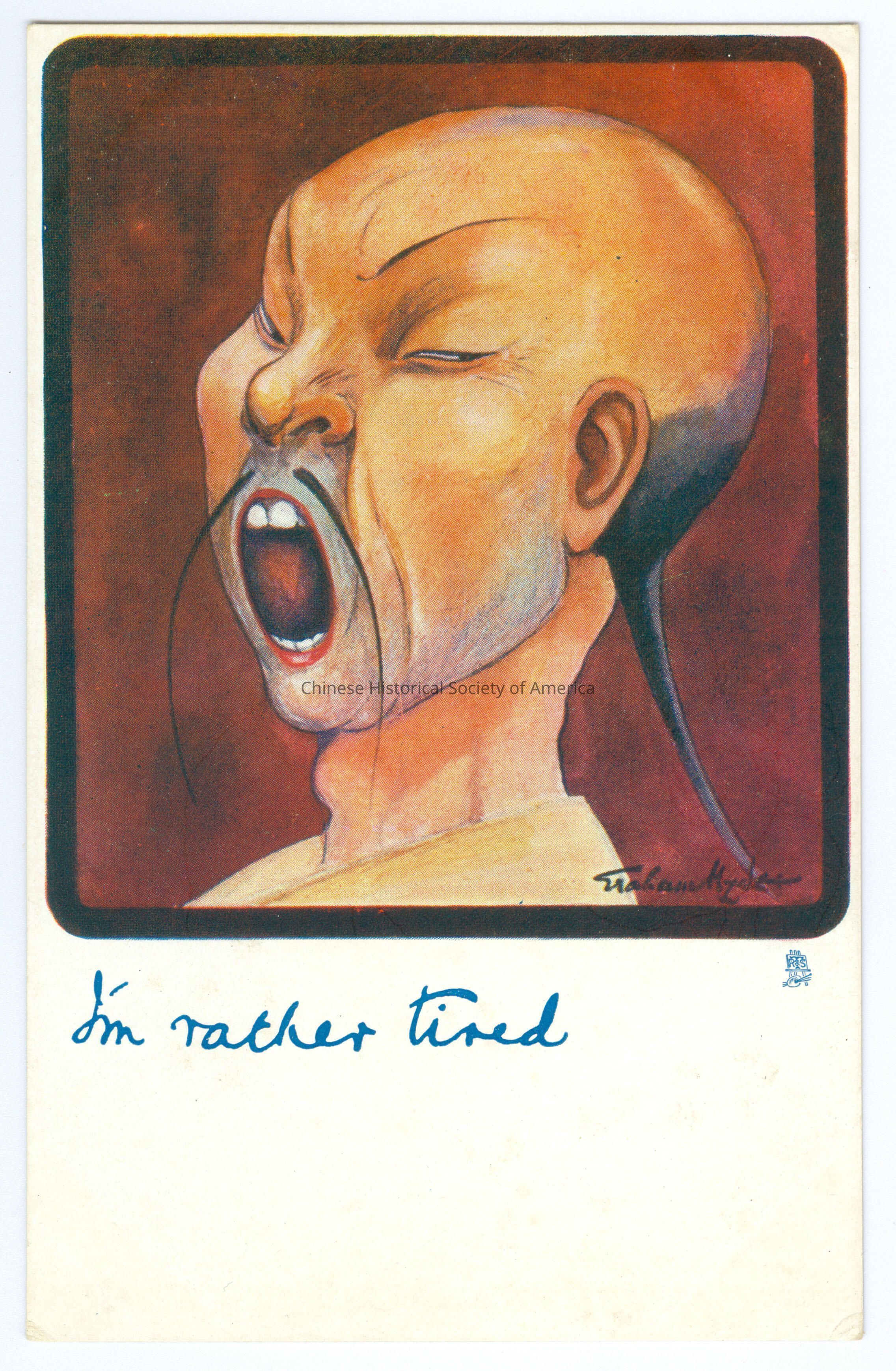 Color. Illus. Eraham Hyde Caricatures; Chinese Men: Head shot of a Chinese man with a queue and slanted eyes and a skinny mustache, he is yawning.