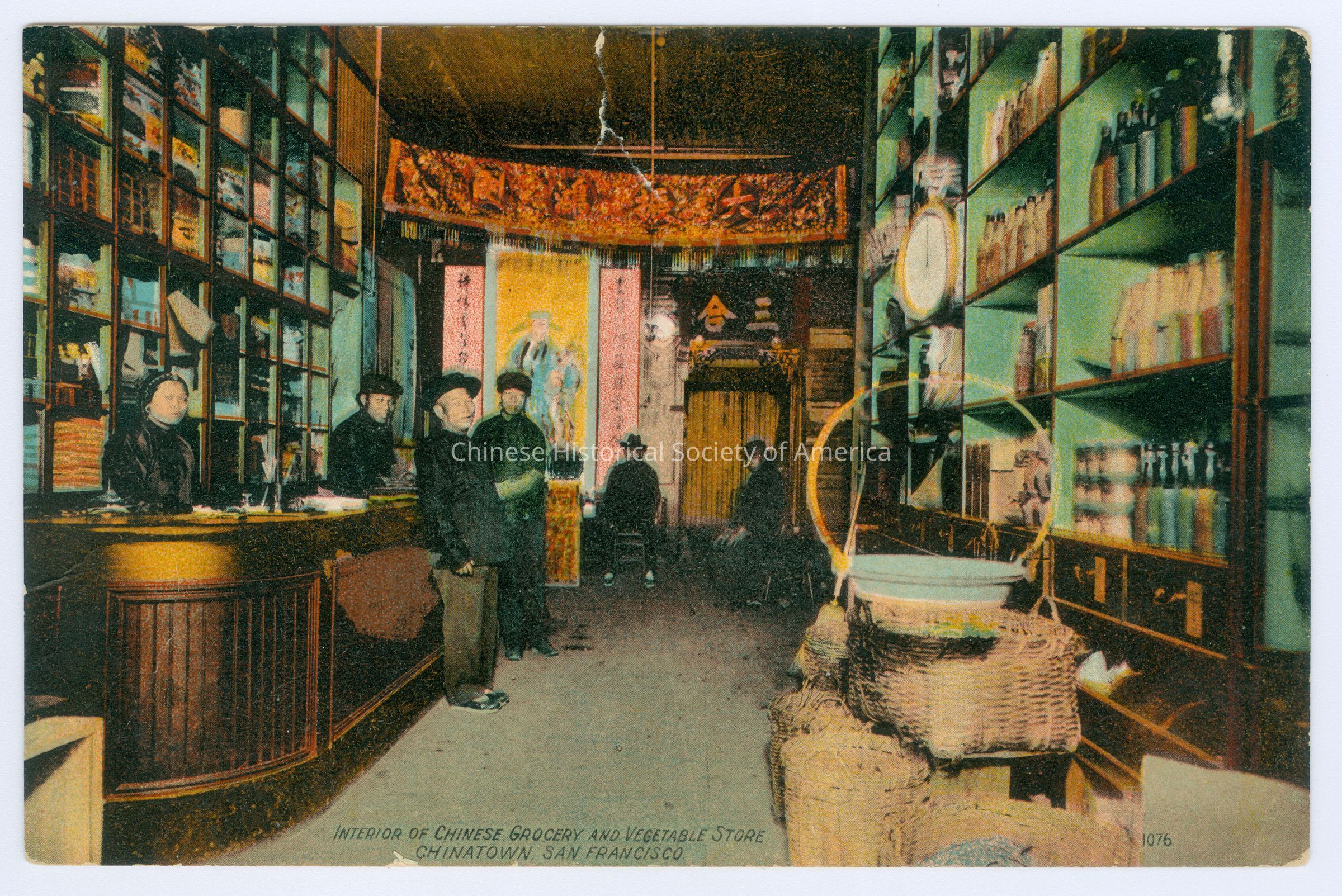 Front: Caption: "Interior of Chinese Grocery And Vegetable Store, Chinatown, San Francisco." "1076." Back: "Info. Text: "1076 Interior of Chinese Grocery and Vegetable Store, Chinatown." "Britton & Rey, Lithographers, S.F. Publishers of Pictorial Pictures".