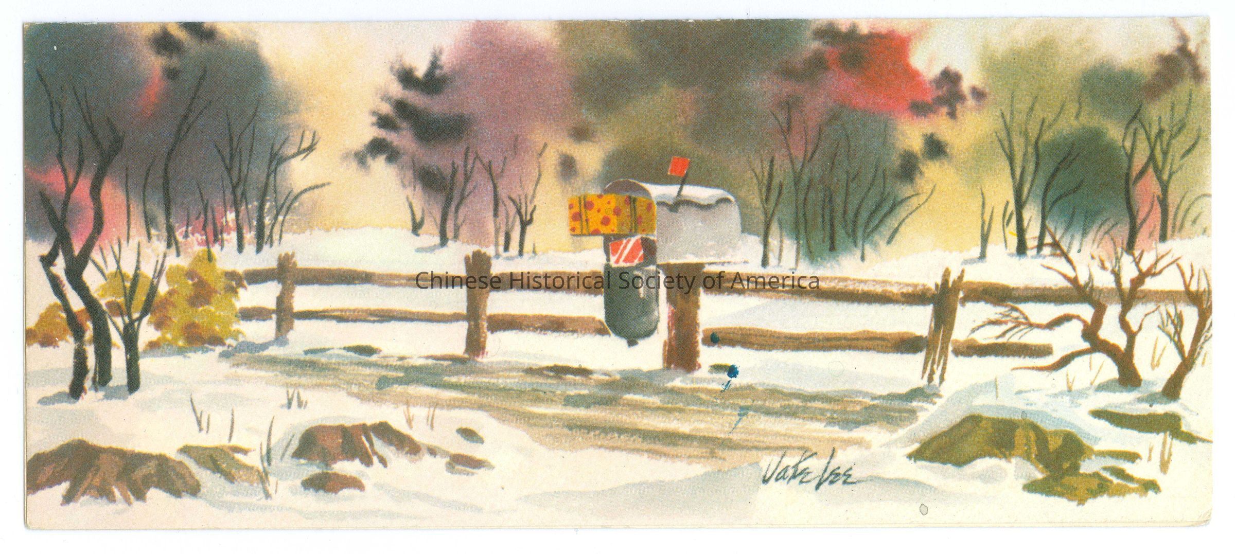 48H22 Christmas greeting card designed by Jake Lee for Alden-Scott's Signed Collection. Snow scene with a mailbox full of presents.Dimensions
