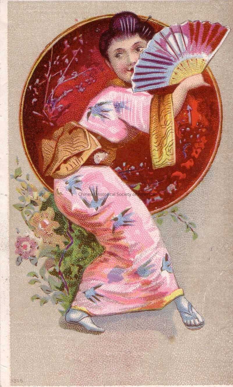 Front: An Asian woman wearing a pink kimono style robe with blue birds emboridered onto it, is posing behind a silver wall, flowers, and a red circular painting. She is peering over her opened blue and pink fan, her hair is pinned up and she is also wearing blue flip-flop sandals.