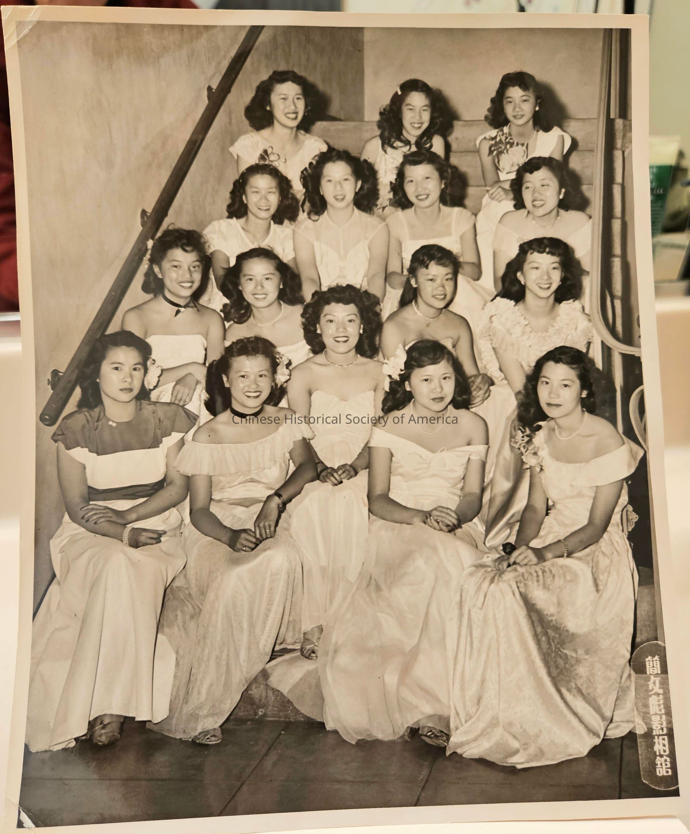 Image of 16 young women in long dresses, one of which is Lorraine Kimlau, 1947.