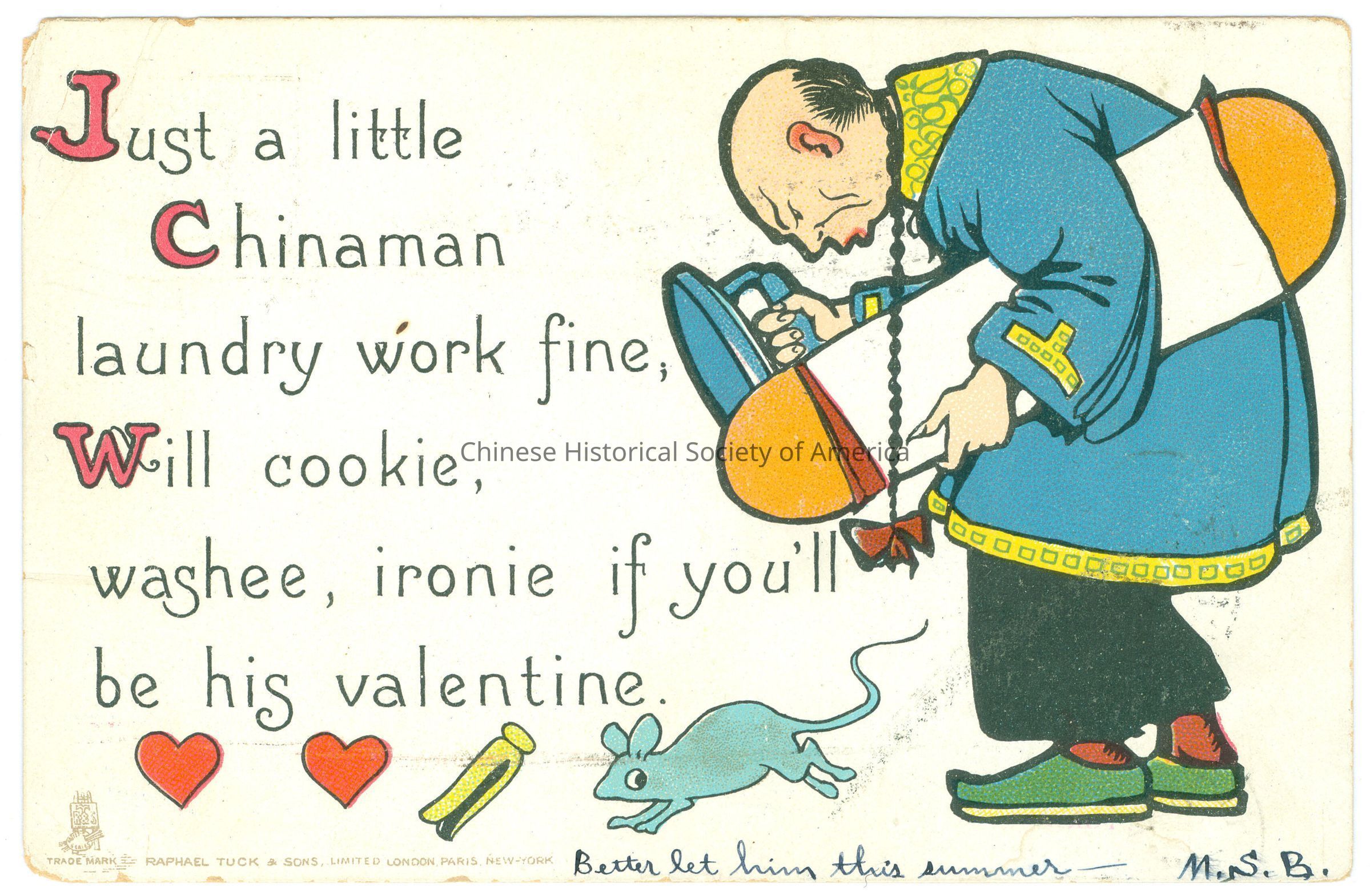 Color. Illus. Caricatures; Valentine Cards; Men; Laundry: Chinese man in traditional blue and black clothing with his head bent and que hanging down his shoulder, his is holding an iron and a ironboard under his arm, a rat and clothespin are at his feet.