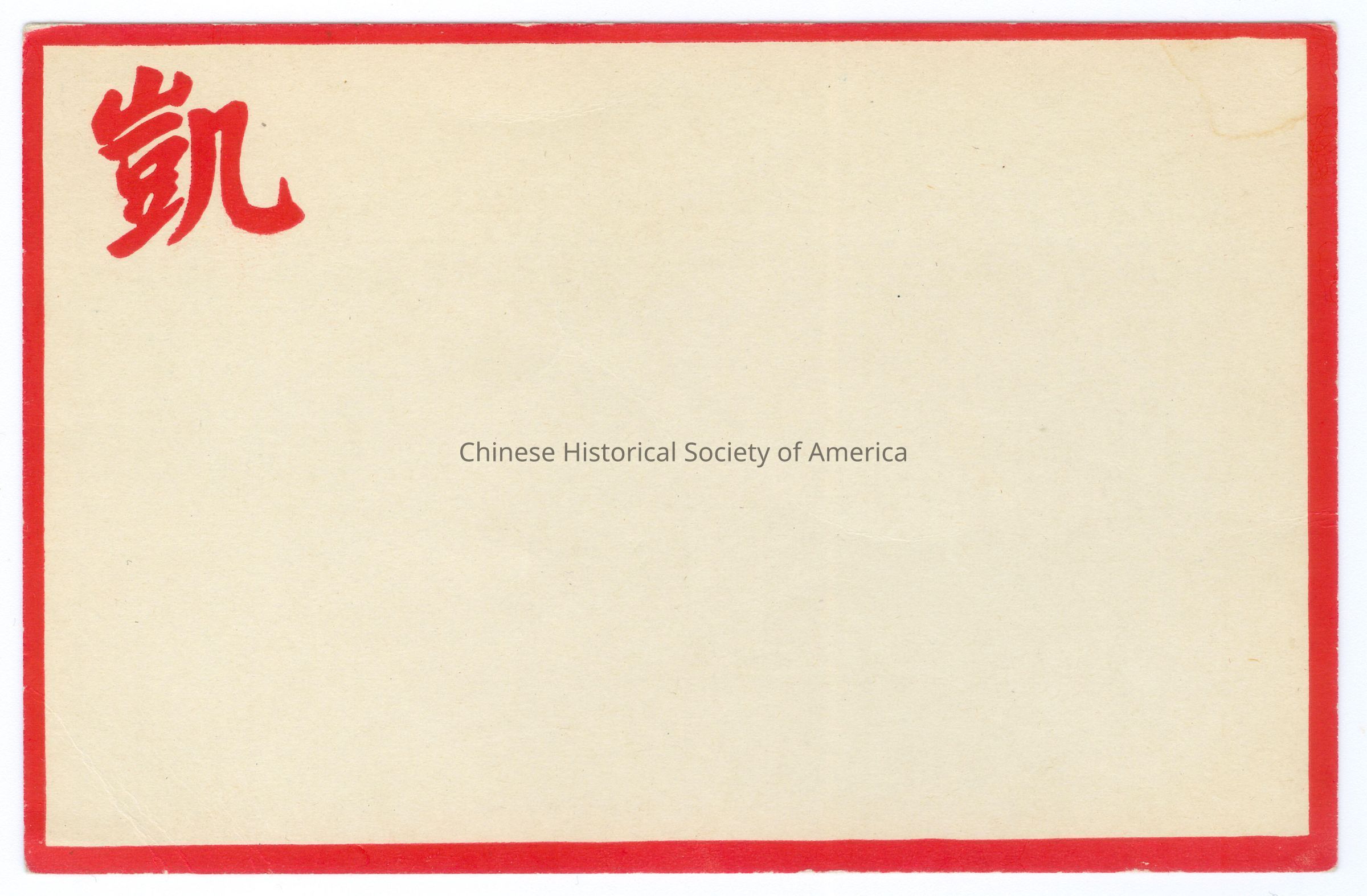 Color. Text. Chinese Characters: A white card with a red border and has one Chinese character "Kai" in red on the upper left hand corner.