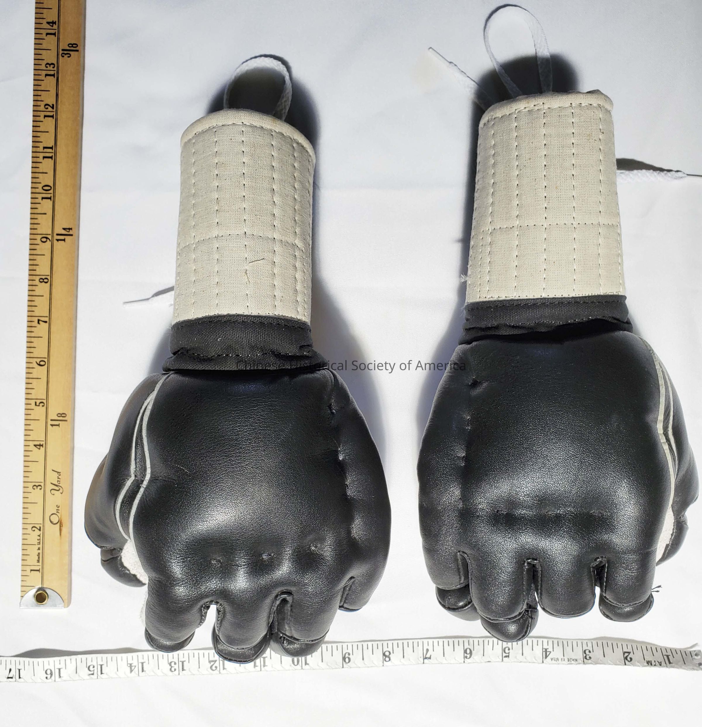 Enter the Dragon gloves, 1970s. (Kendo gloves for stick fighting) used for fighting and grappling, replica. Black and cream color.Context