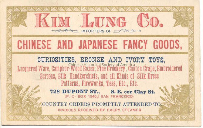 Curiosities, Bronze and Ivory Toys, Lacquered Ware, Camphor-Wood Boxes, Fine Crockery, Canton Crape, Embroidered Screens, Silk Handkerchiefs, and all Kinds of Silk Dress Paterns, Fireworks, Teas, Etc.