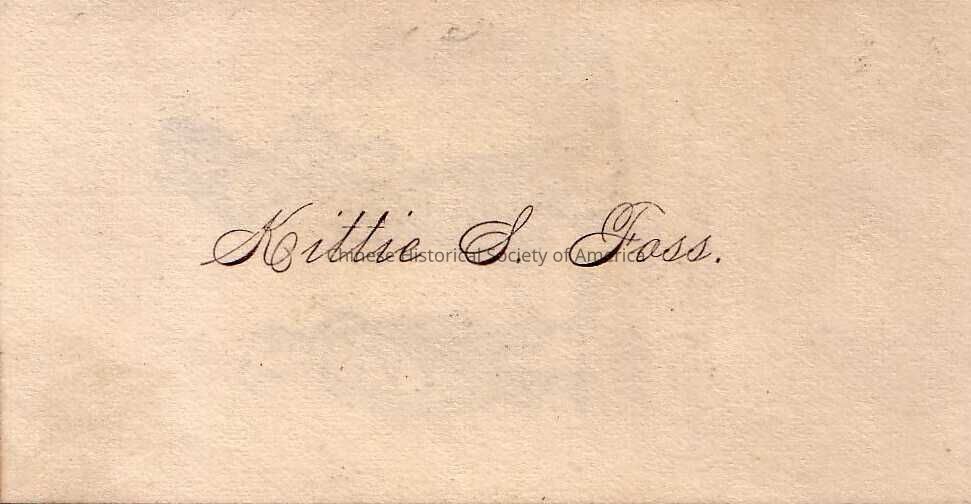 Front: The name "Kittie S. Foss" is printed in cursive writing at the center of the card. If you look into the light with the card, you can also see a Chinese man with a queue and an American women holding a fan standing next to one another.
