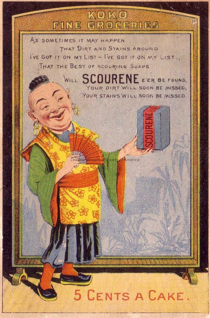 Front: A Chinese man wearing a blue robe with green sleeves and a yellow vest with red flowers over it is standing on the left side of the tradecard while he holds a red fan in one hand and a box of Scourene scouring soap on the other. Advertised in the tradecard is the following poem: