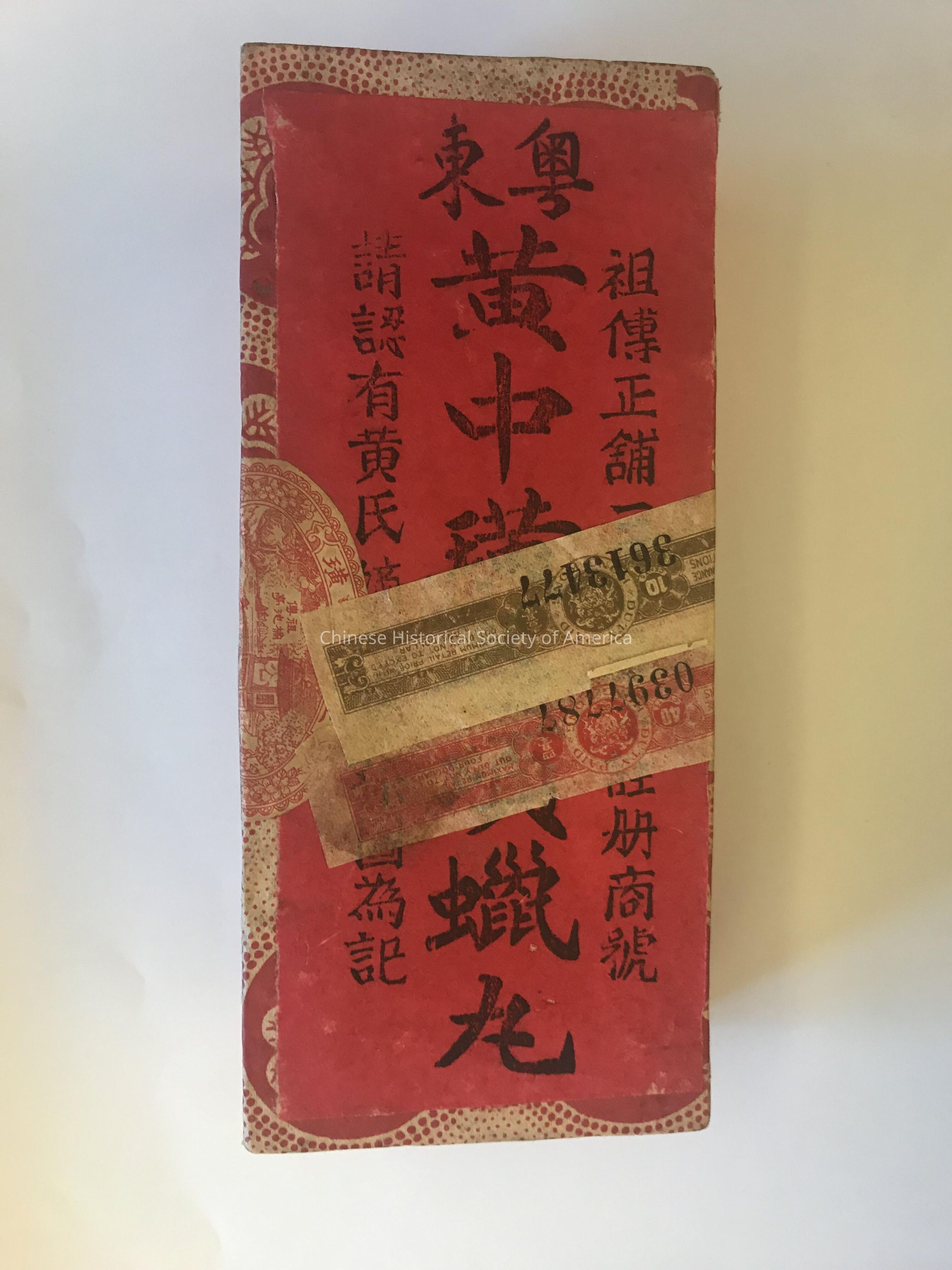 "Unopened" "Lap Yuen" box. Box is covered in red and white floral paper with a red label pasted on the top. Stuck on the top are 2 narrow labels that read "Duty Paid-Hong Kong."