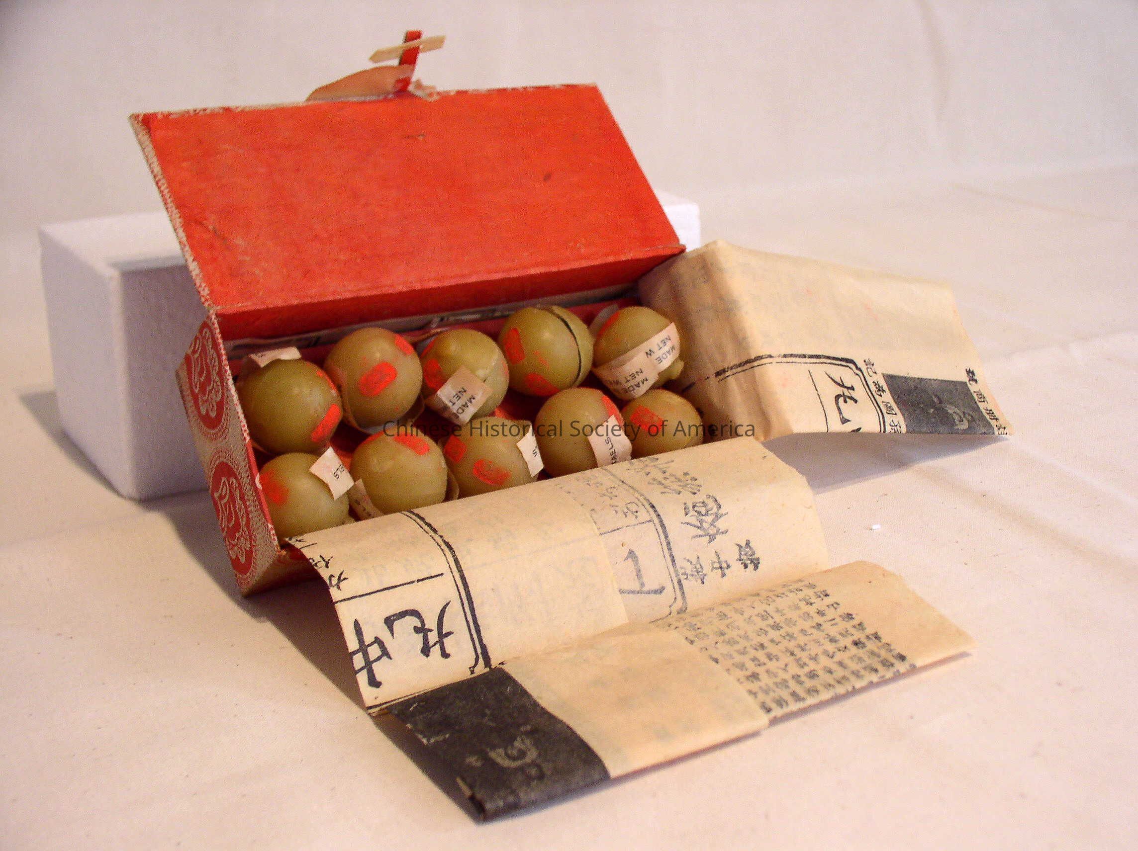 A: Box, B: Insert, C-L: Lap Yuen. Inside red box are 10 wax covered balls. Within the wax balls are dark pills to use for indigestion or for a woman's menstrual pain.Context