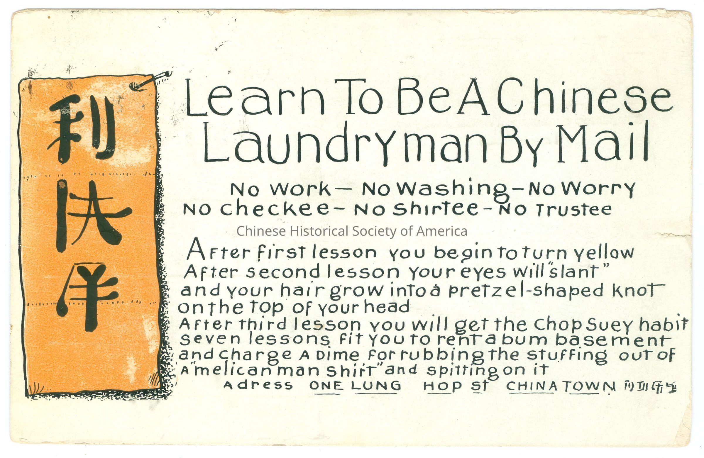 Front: Caption: "Learn To Be A Chinese Laundryman By Mail - No work - no washing - no worry no checkee - no shirtee - no trustee, After first lesson you begin to turn yellow after second lesson your eyes will "slant" and your hair grow into a pretzel-shaped knot on the top of your head. After third lesson you will get the chop suey habit seven lessons fit you to rent a bum basement and charge a dime for rubbing the stuffing of a "melican man shirt" and spitting on it.a dress one lung hop st. china town". Back: Message: "Hello Son: How is with from [ILLEGIBLE] be you? Since you and I have to Unionville I have just been crazy for it [ILLEGIBLE] and I [ILLEGIBLE] up have to [ILLEGIBLE].