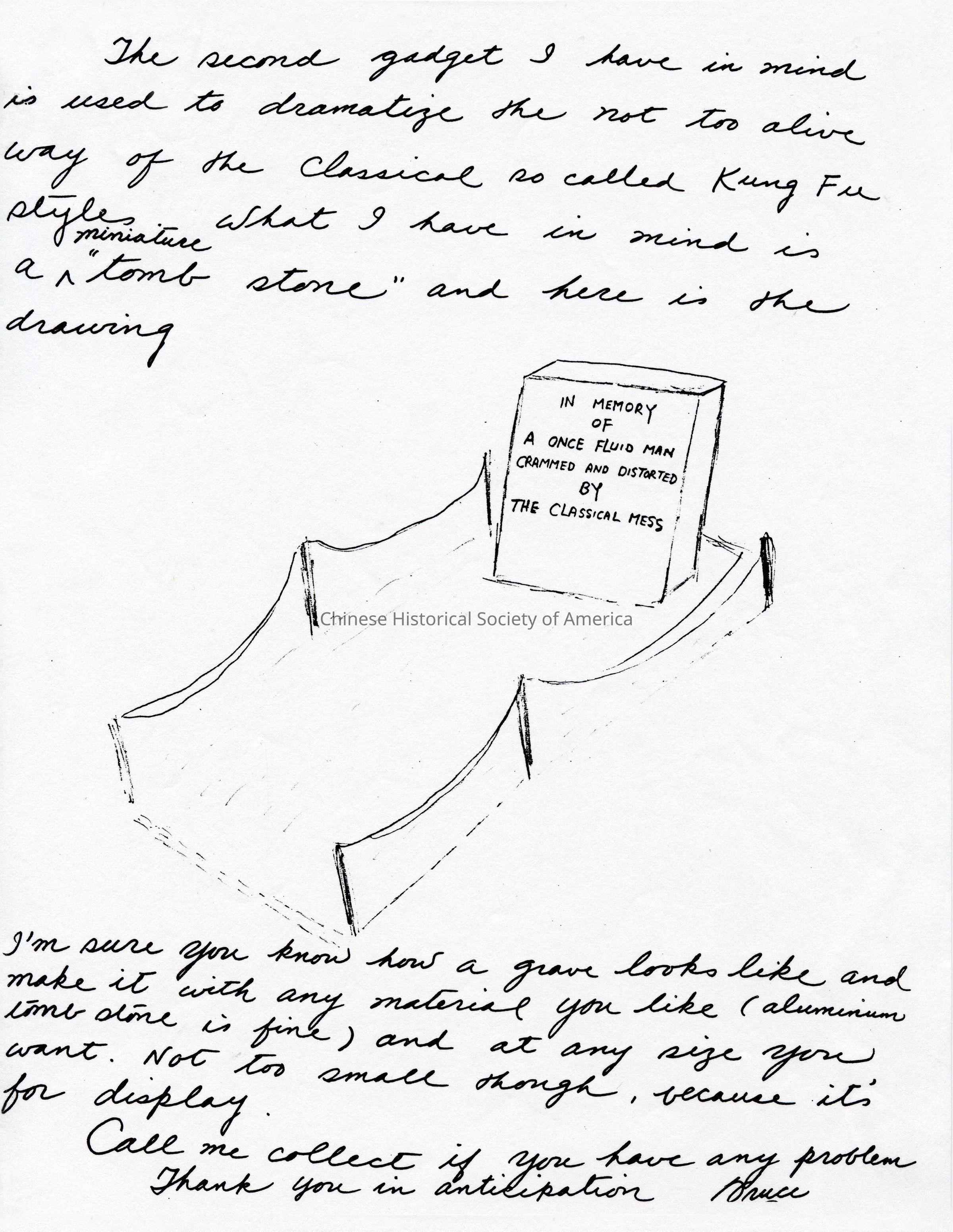 Handwritten letter with sketch by Bruce Lee proposing ideas for the design of a small scale model of a tombstone, with the headstone reading "In Memory of a once fluid man crammed and distorted by the classical mess." mid-1960s.Context