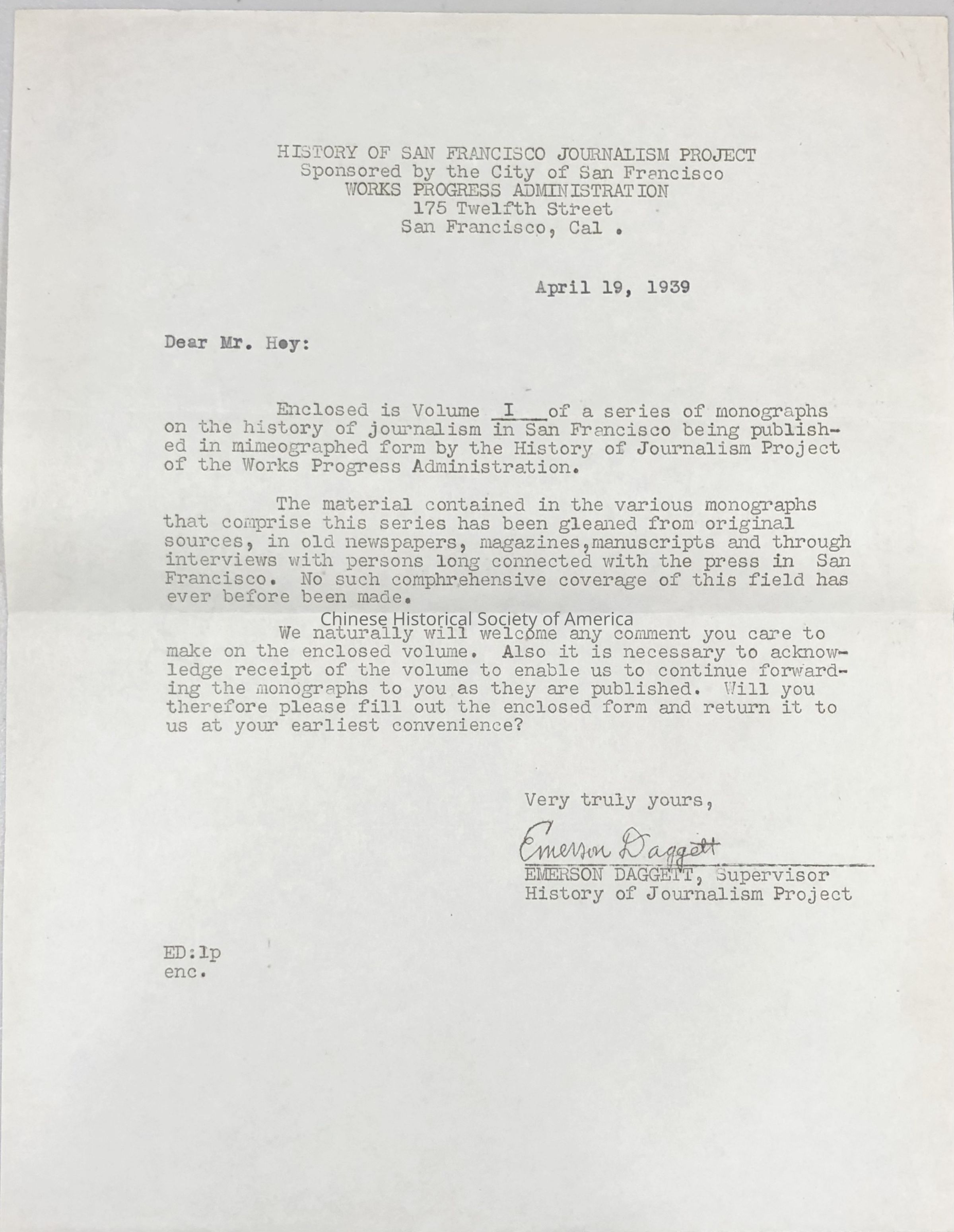 Letter transmitting Volume I of a series on the history of journalism in San Francisco published in mimeograph form by the Works Progress AdministrationContext