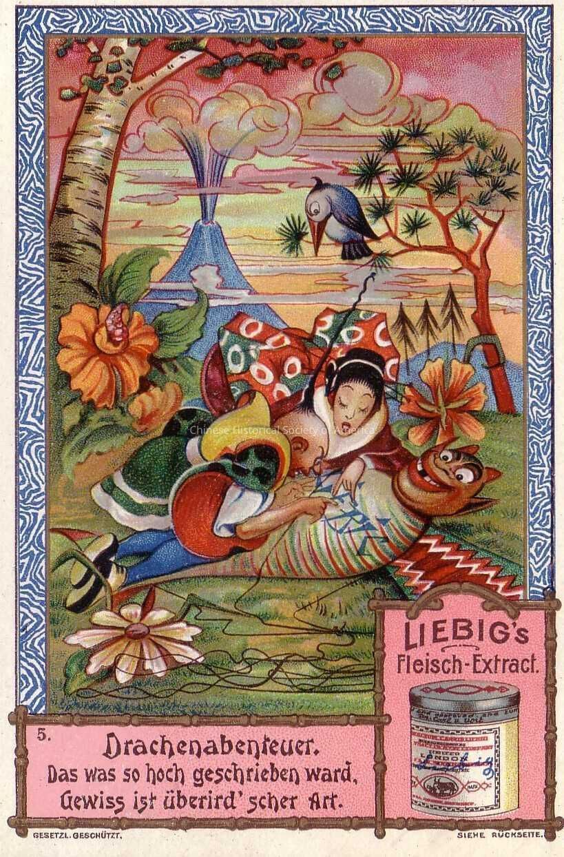 Front: Enclosed in a blue and white border is a woman wearing a red, green, and white dress, and a man with his queue sticking vertically up crouching down on a field of grass as they work to repair a Liebig's bird-shape kite. A roaring blue volcanic mountain sits in the background as trees, flowers, and a bird perched on a tree branch decorate the scene. On the lower right hand corner is an illustration of the Liebig's Fleisch Extract product and the following can be found highlighted in pink at the bottom: "Drachenabenreuer. Das was so hoch geschrieben ward, Gewiss ist uberird scher art."