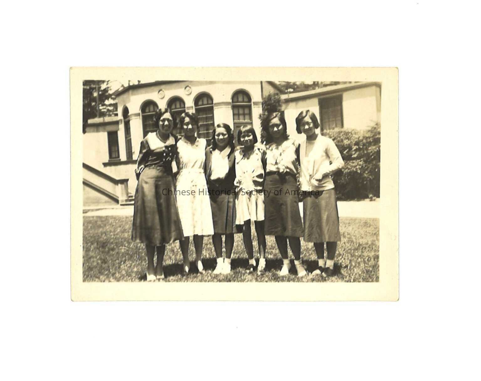 Lily Leong on the left with five other girls all wearing dresses and skirts. They pose on the grass in front of a building. Copy 2.
