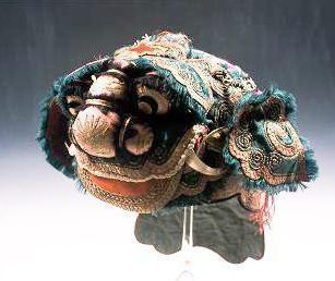 Green lion hat with large padded snout and moveable eyes, above a large red tongue.Context