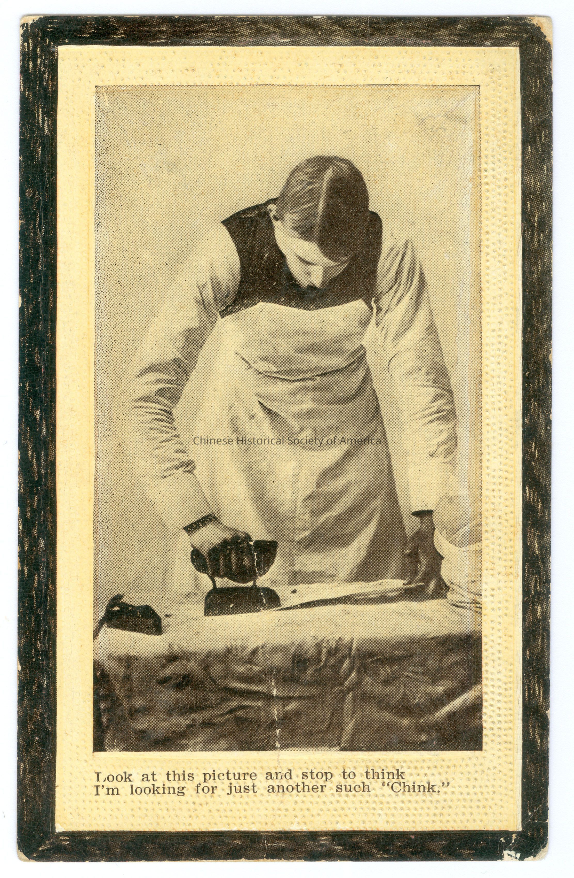 B&W. Photo. Men; Laundry: A White man in a black vest and white apron is ironing a a collar.