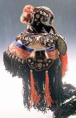 Chinese opera style hat is constructed with silk covered and embroidered paper collar elements embellished with embroidered trims, metal beads and read and black silk fringe.Context