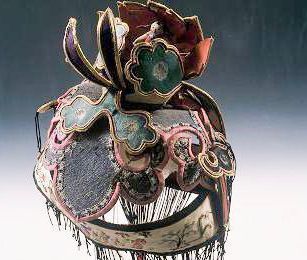 Chinese opera style hat constructed with silk covered paper elements embellished with embroidered trims and gilt paper edges.Context