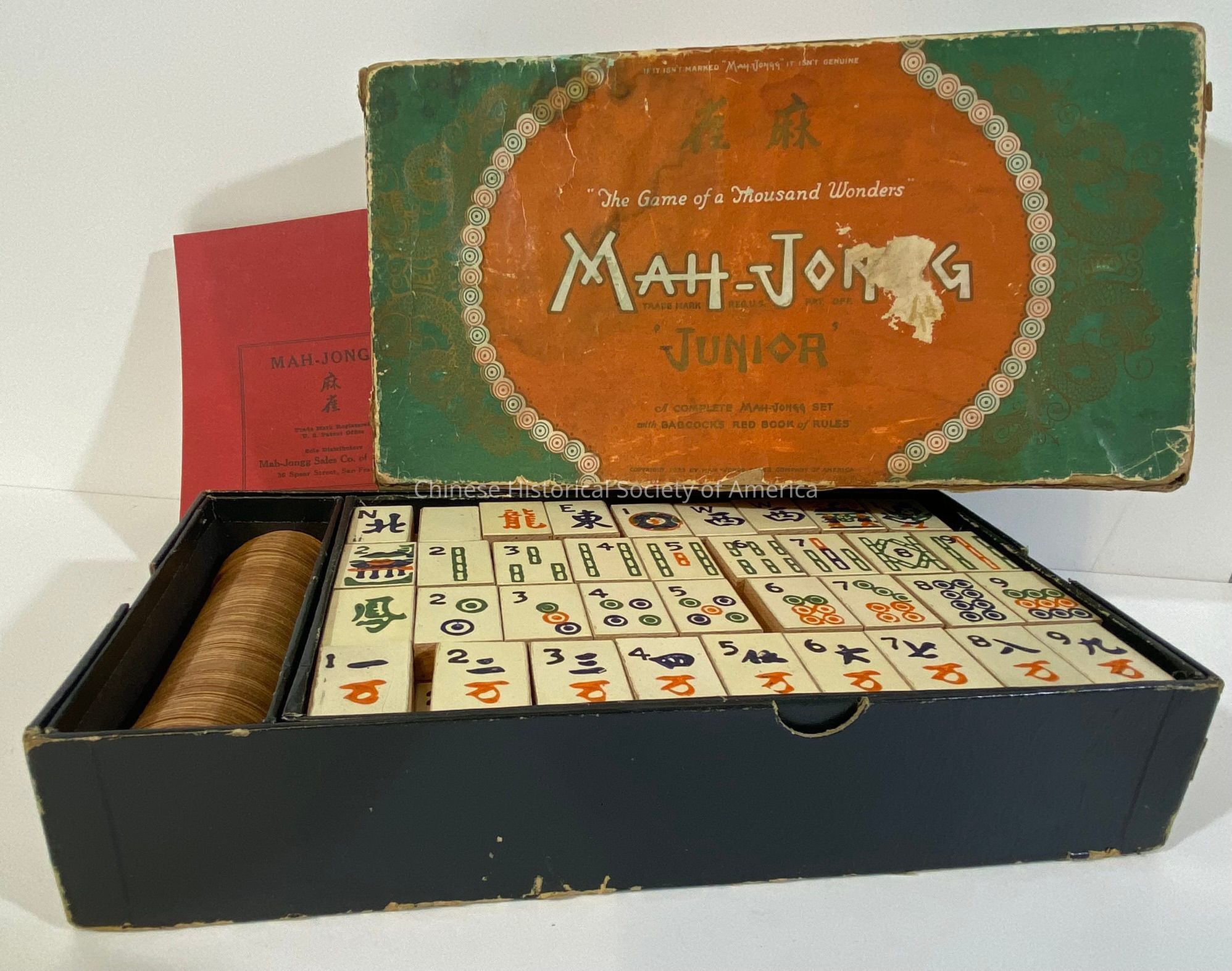 Complete "Mah-Jong Junior" set with original chips, dice, instructions, and box. The lid reads, "The Game of a Thousand Wonders, Mah-Jong: Junior;" with a green and orange dragon and floral background. Manufactured by the Mah-Jongg Sales Co. of America, San Francisco, New York, and Chicago;" Chinese character border with dragon design.