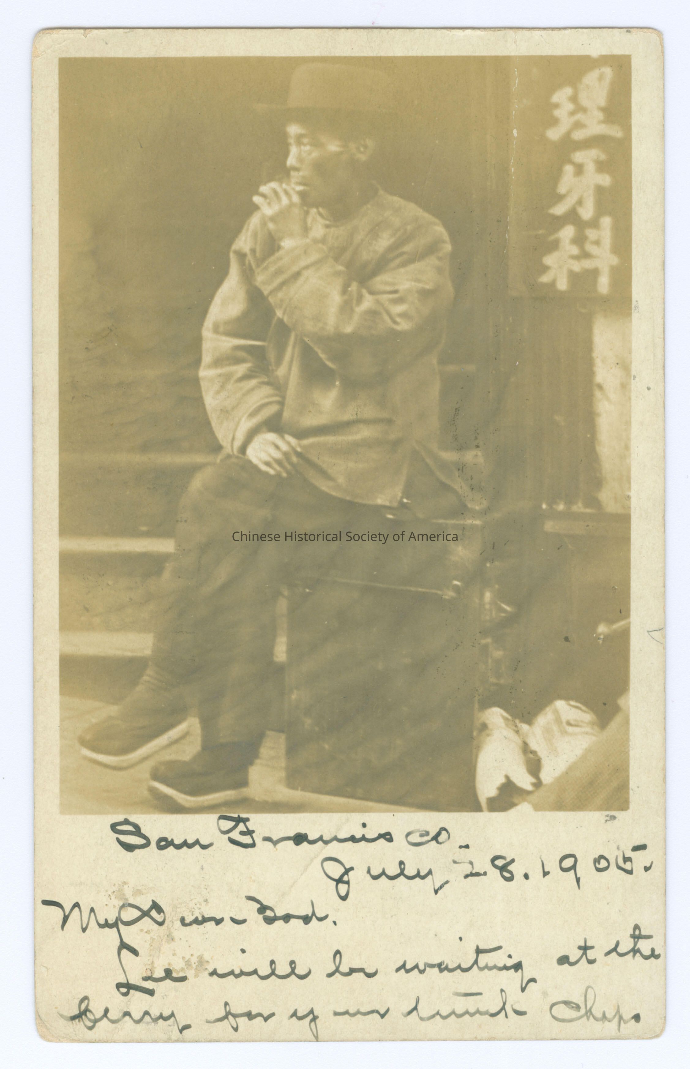 Front: Message: "San Francisco-July 28.1905. My Dear [Bud] Le will be waiting at the ferry for your b___k chip.", handwritten in black. Back: Postmark: "San Francisco, Cal. Jul 31 1905 5-AM"; "Washington D.C. 1905", stamped in black. Stamp: A green stamp with Benjamin Franklin's image.