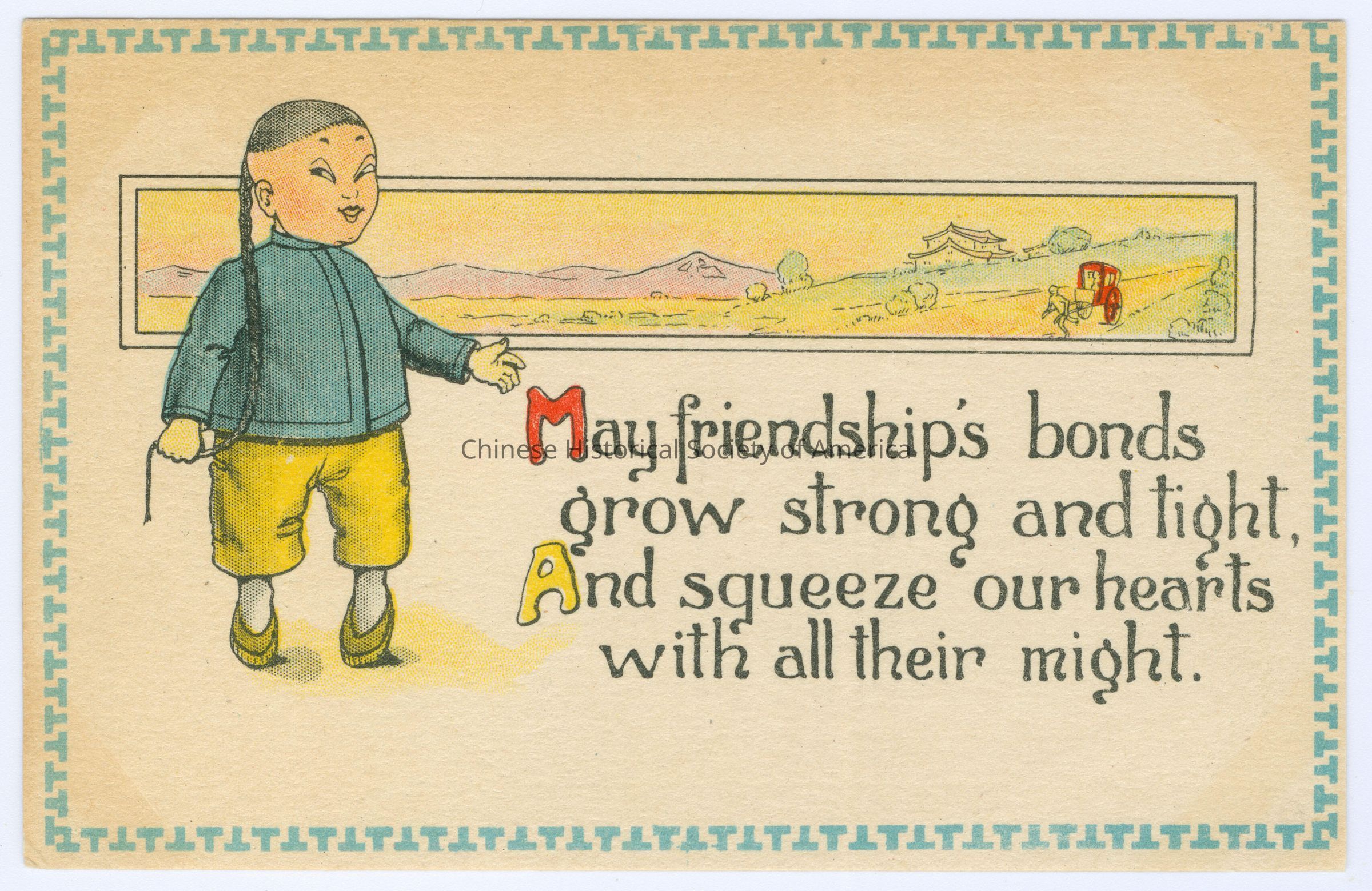 Color. Illus. Caricatures; Chinese Men: A cute little chubby Chinese man, has a queue that he is holding on one hand with a hat and blue shirt and yellow pants, there is a background of scenery and a horse drawn wagon.