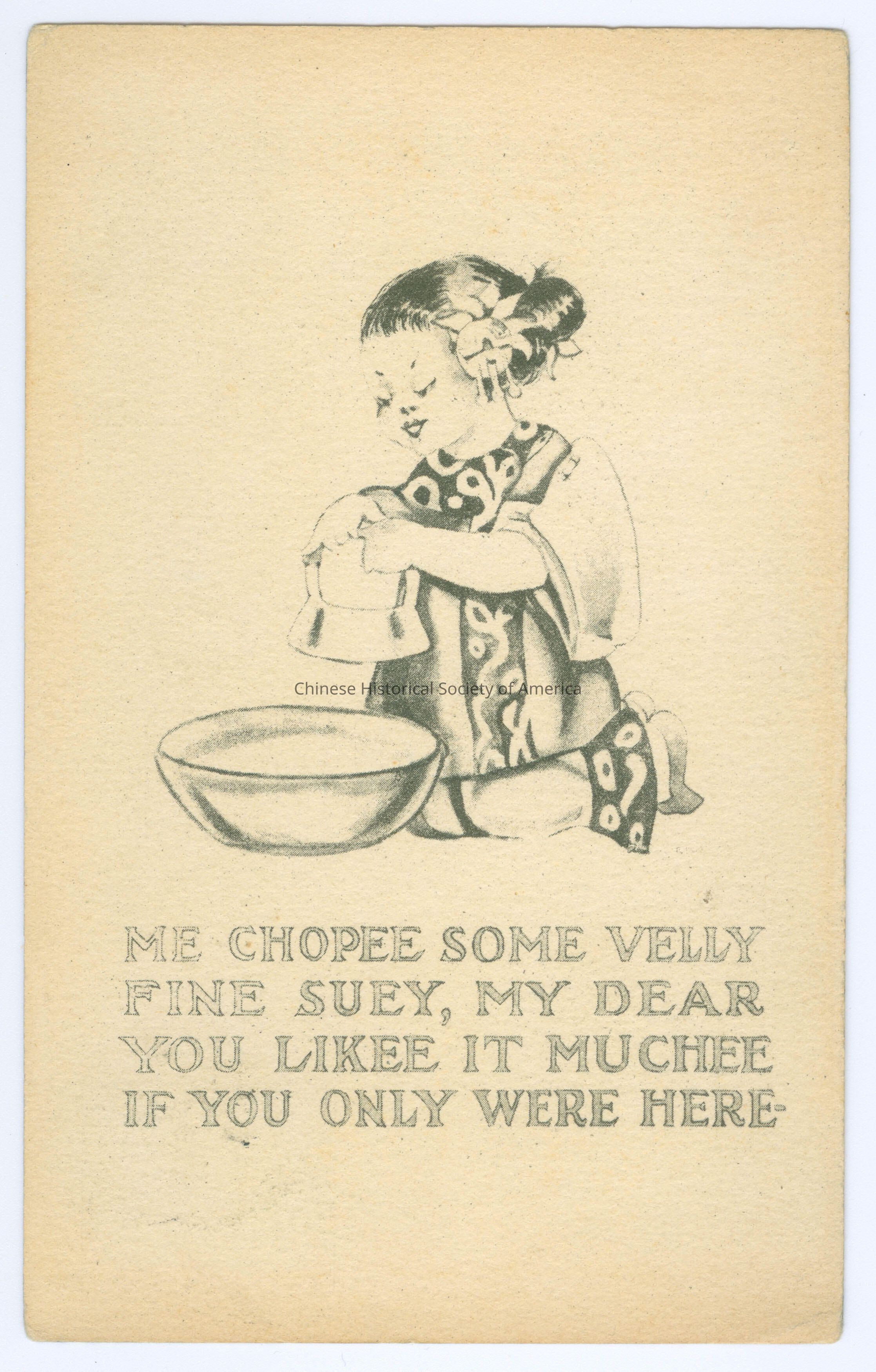 Front: Caption: "Me choppee some velly fine suey, my dear you likee it muchee if you only were here-." Back: Postmark: "Aug 1912", stamped in black. Stamp: A green one cent stamp with a side picture of George Washington, "U.S. Postage, 1 Cent 1." Addressee: Mr. C.O. Miller 4005 17th St. San Francisco Calif." Message: "Dear [ILLEGIBLE] Reid, Send my love to all the [ILLEGIBLE] your card. I should say I am having a good time. Fell asleep in [ILLEGIBLE] the other day, shot a rabbit on the ranch. Went to a minstrel show + dance. Love, May". Old Accession #: TEX
