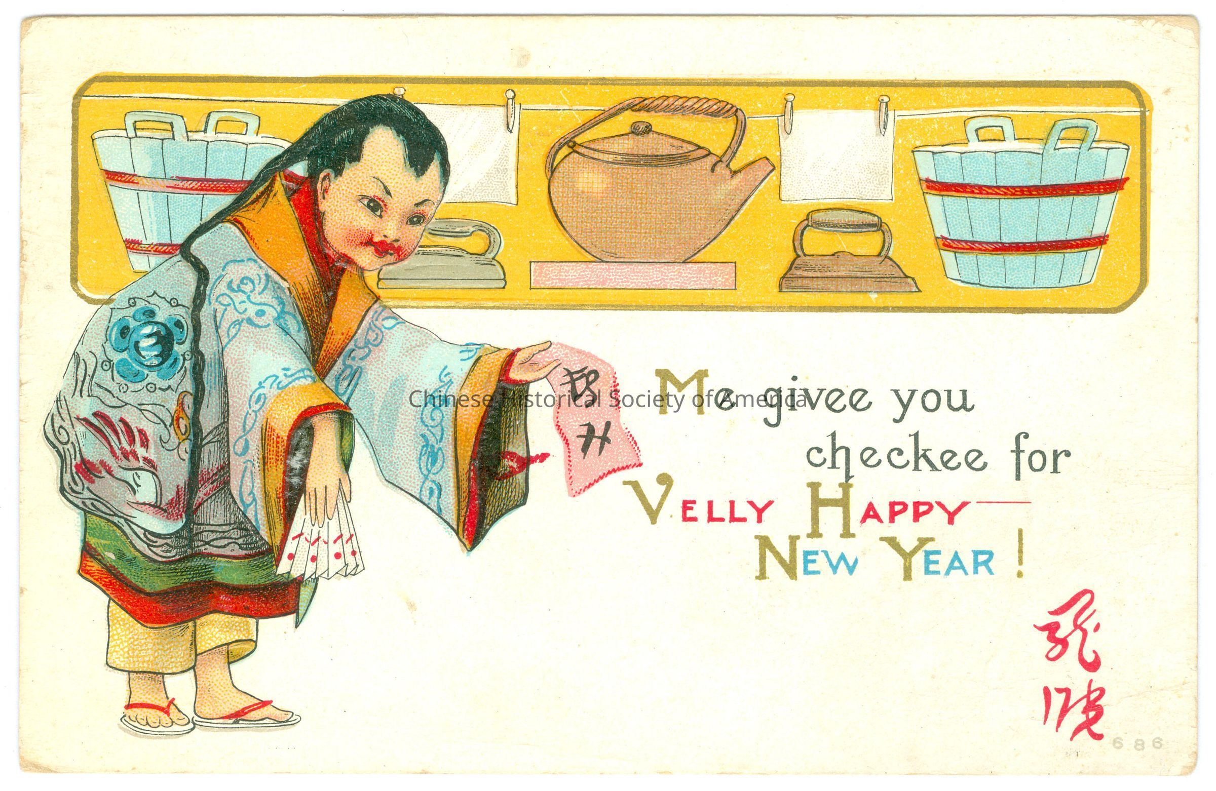 Front: Caption: "Me givee you checkee for Velly Happy New Year!." Back: Postmark: "Cortland, N.Y. Jan 8 1913 6:30 PM", stamped in black. Stamp: A green one cent stamp with a side picture of George Washington, "U.S. Postage, 1 Cent 1." Adddress: "Mr. N.g. Heffron Dryclen NY. Rant 20" "for Eleanor from Grand mco Heffron" Old Accession #: D)-