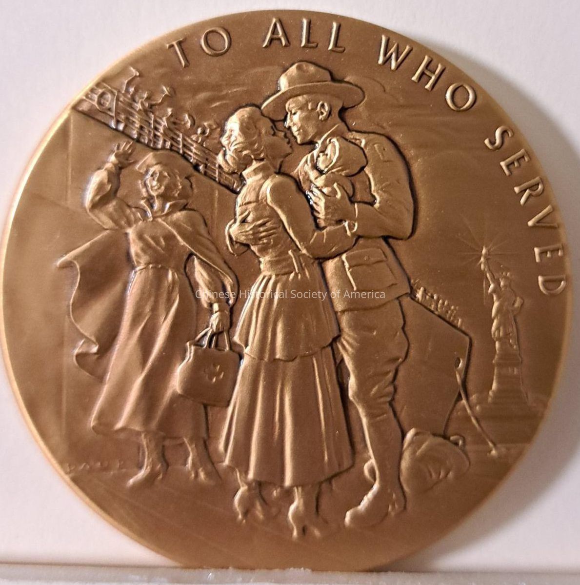 One of two commemorative World War I medals - features an image of Sergeant Sing Kee with other soldiers from a photograph. Sing Kee was with the 77th Division. Reliefs on recto and verso. One of two.Context