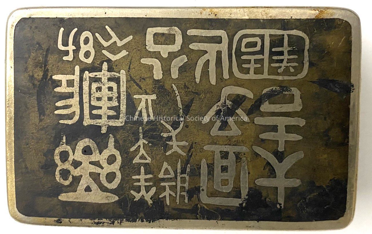 Metal box with Chinese writing on the top. The lid is stuck, so we do not know for sure, but it appears to be an ink pad box.