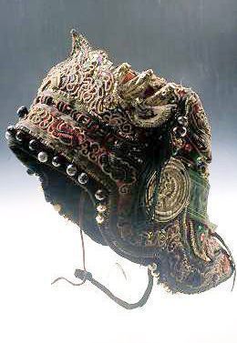 Densely embroidered and embellished padded hat with floral designs in colored and metallic threads.Context