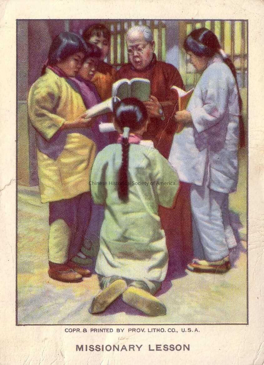 Front: An elderly Asian man with grey hair and wearing a red-burgundy robe has a book clutched to his hand as a group of five women encircle around him. Three of the women are huddle to his right while a woman in blue is to his left and a woman in green is kneeling in front of him. The notation on this tradecard is the following:
