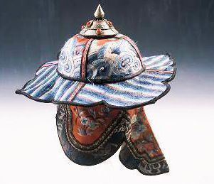 Blue and white embroidery on red silk. Foliate rim has striped satin stitch embroidery with waves on the bowl of the hat which is topped with a silver and simulated glass finial with Mongol script.Context