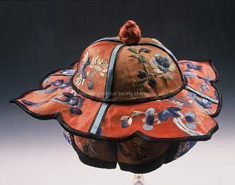 Red silk with blue and white embroidered flowers on the cap and brim.Context