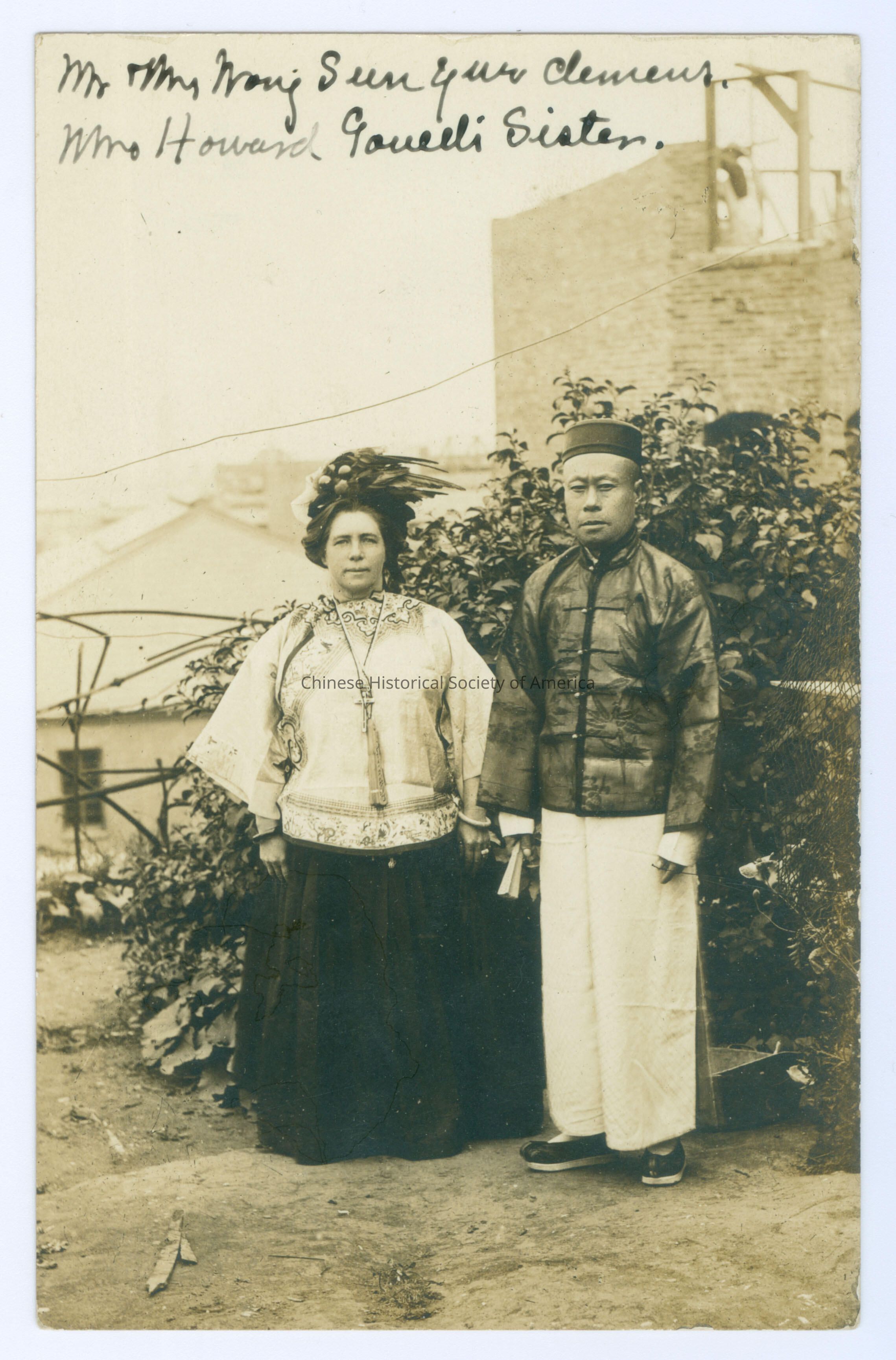 See CHSA-04279-04281, 04284, 04875. Front: "Mr. and Mrs. Wong Sun Yue Clemens. Mrs. Howard Gould's Sister.", handwritten in black. Back: "Mr. and Mrs. Wong Sun Yue Clemens Relics Dug From The Ruins 535 Grant Avenue San Francisco Calif.", stamped in purple ink. Old Accession #: DKE