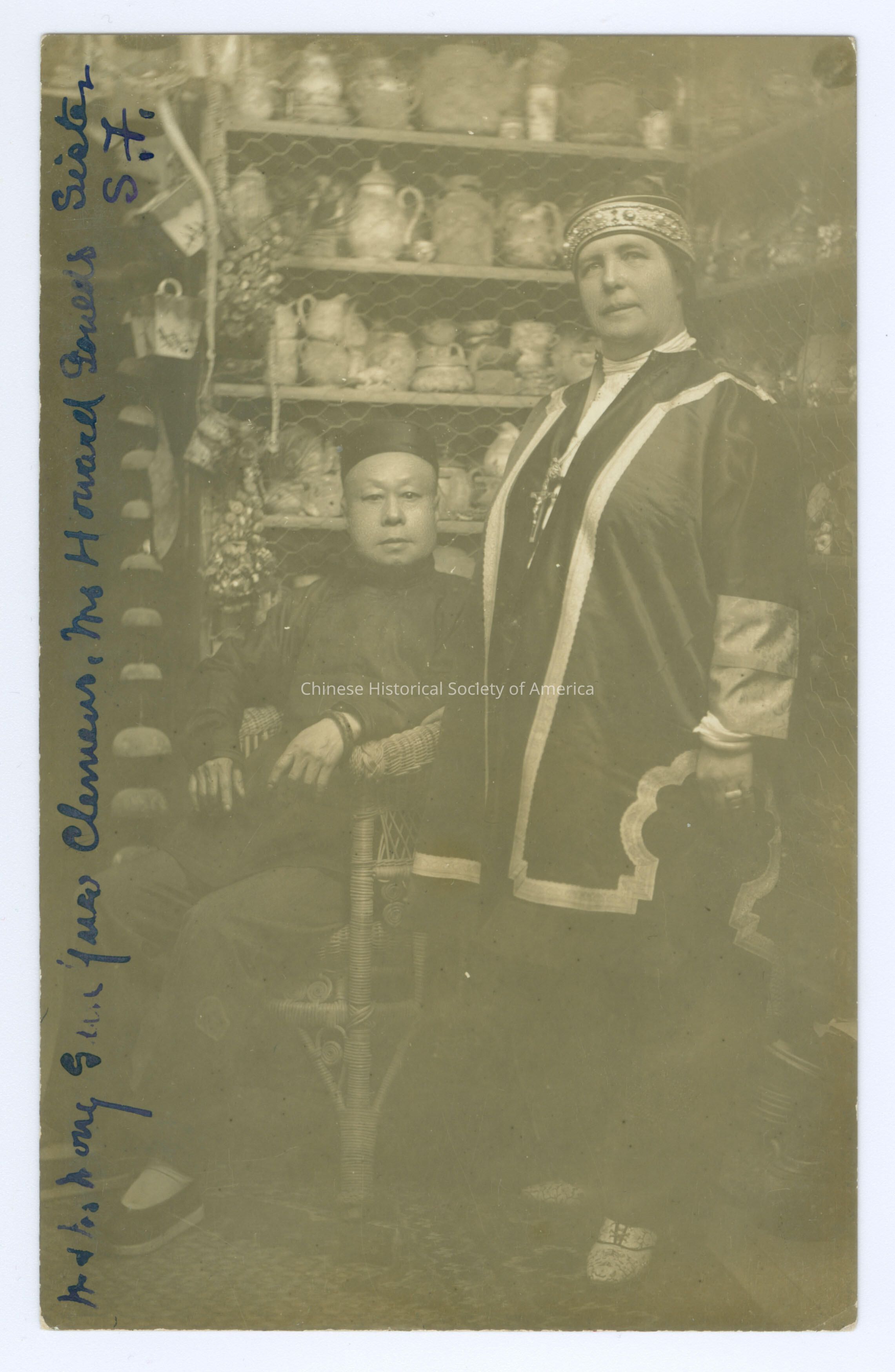 See CHSA-04279-04281, 04284, 04875. Front: "Mr. and Mrs. Wong Sun Yue Clemens. Mrs. Howard Gould's Sister S.F.", handwritten in blue. Back: "Mr. and Mrs. Wong Sun Yue Clemens Relics Dug From The Ruins 897 Sacramento St. Cor. Stockton San Francisco". Old Accession #: IKE