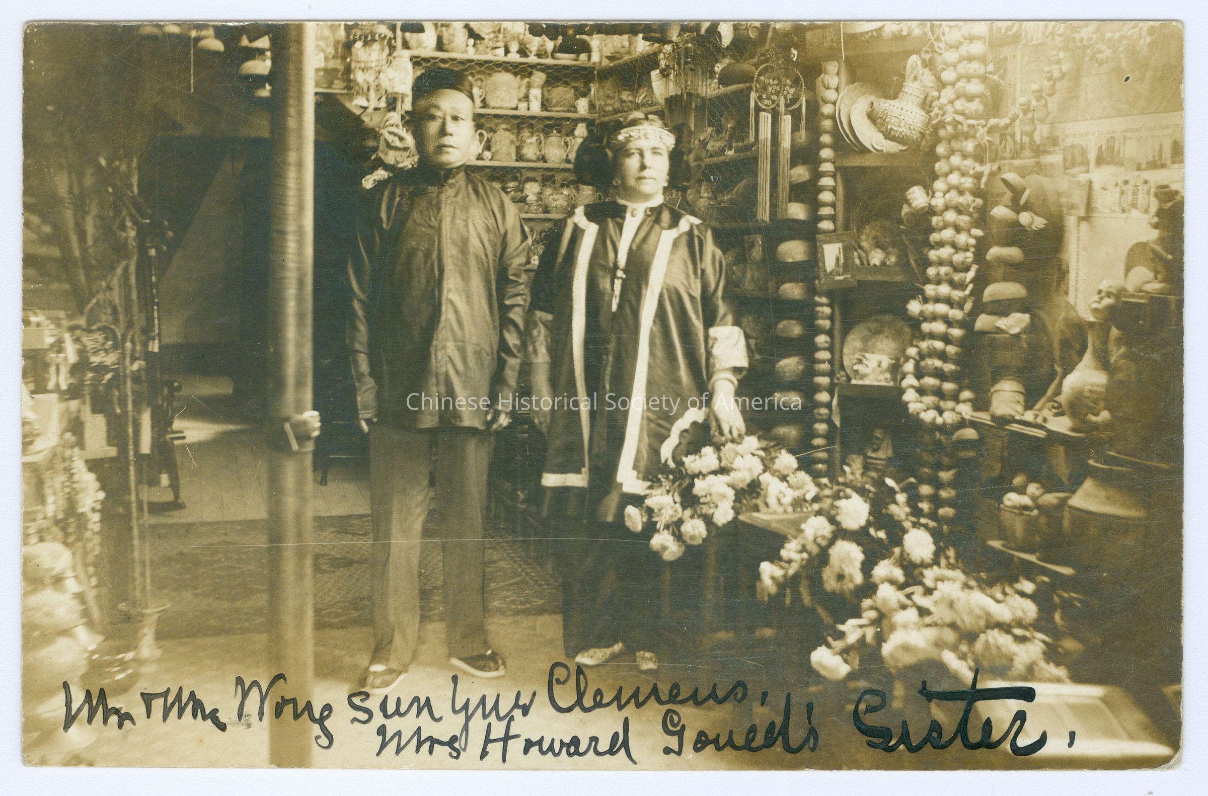 See CHSA-04279-04281, 04284, 04875. Front: "Mr. and Mrs. Wong Sun Yue Clemens. Mrs. Howard Gould's Sister.", handwritten in black. Back: "Mr. and Mrs. Wong Sun Yue Clemen Relics Dug From The Ruins 535 Grant Avenue San Francisco Calif.", stamped in purple ink