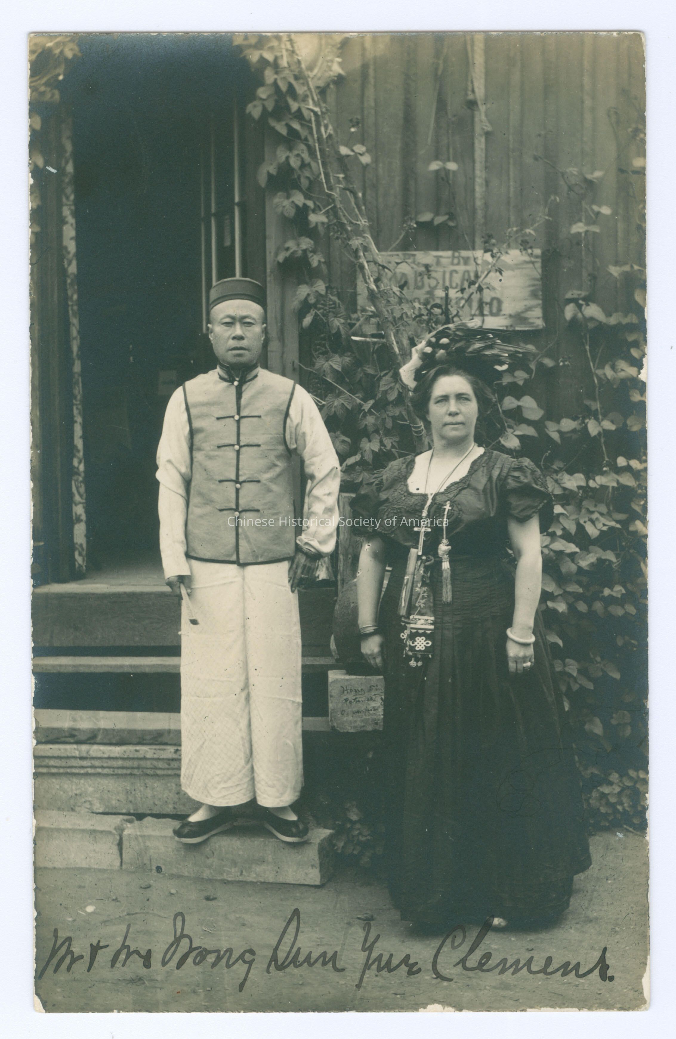 B&W. Photo. SF; Mr. and Mrs. Wong Sun Yue Clemens: Outside scene of a Chinese man and a White woman, the man is wearing a vest and the woman is wearing a western dress with a hat and wearing crosses on her neck.