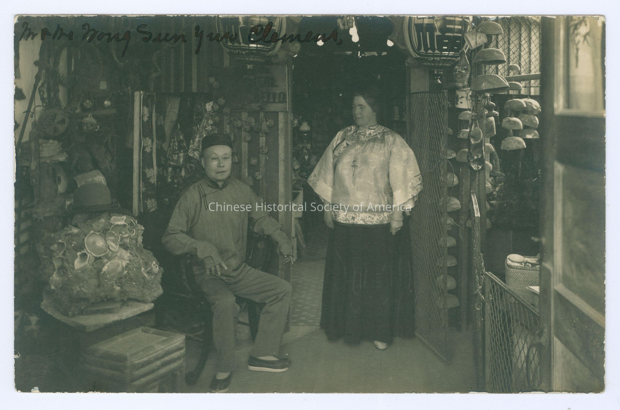 B&W. Photo. SF; Mr. and Mrs. Wong Sun Yue Clemens: A Chinese man and White woman are inside a store, he is sitting in a chair and she is standing wearing a Chinese shirt and skirt, they are in a store that has wind chimes, furniture, and lanterns.