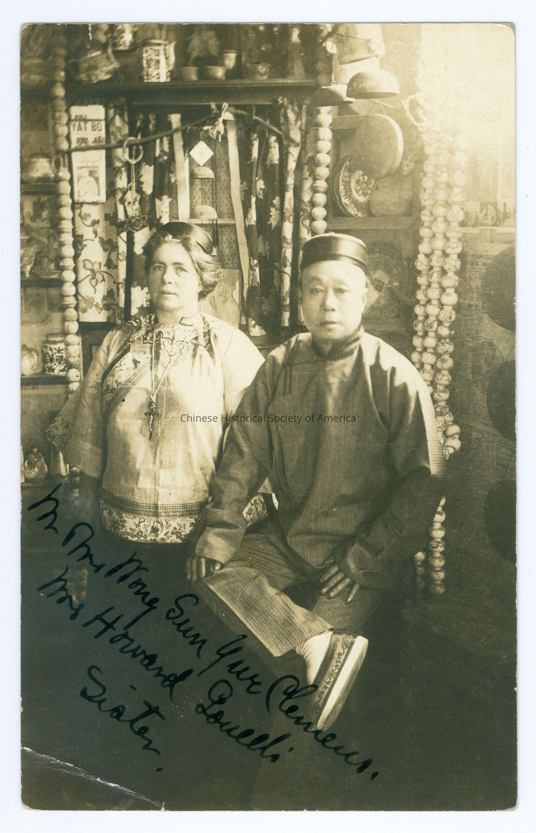 See CHSA-04279-04281, 04284, 04875. Front: "Mr. and Mrs. Wong Sun Yue Clemens. Mrs. Howard Gould's Sister.", handwritten in black. Back: Mr. and Mrs. Sun Yue Clemens Relics Dug From The Ruins 535 Grant Avenue San Francisco Calif.", stamped in purple.